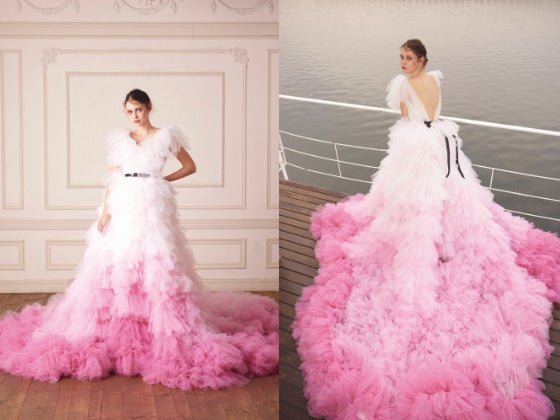珍しいグラデーションカラーのチュールは、例外なく手染め。カラーはオンブル(グラデーション)ピンク。首元も背中もV字に開いたドレス。白とピンクのグラデーション×チュール素材の一見フェミニンな組み合わせだが、背中の大胆な開きやウエストの黒いリボンによって程よく抜け感とメリハリが出るドレス。