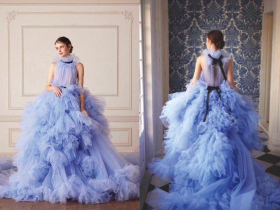 首元までチュールに包まれる、ハイネックドレス。カラーはブルー。少しパープルも感じる絶妙な色。ウエストと首元で結ぶ黒のグログランリボンがポイント。スカート部分のチュールはアシンメトリー。