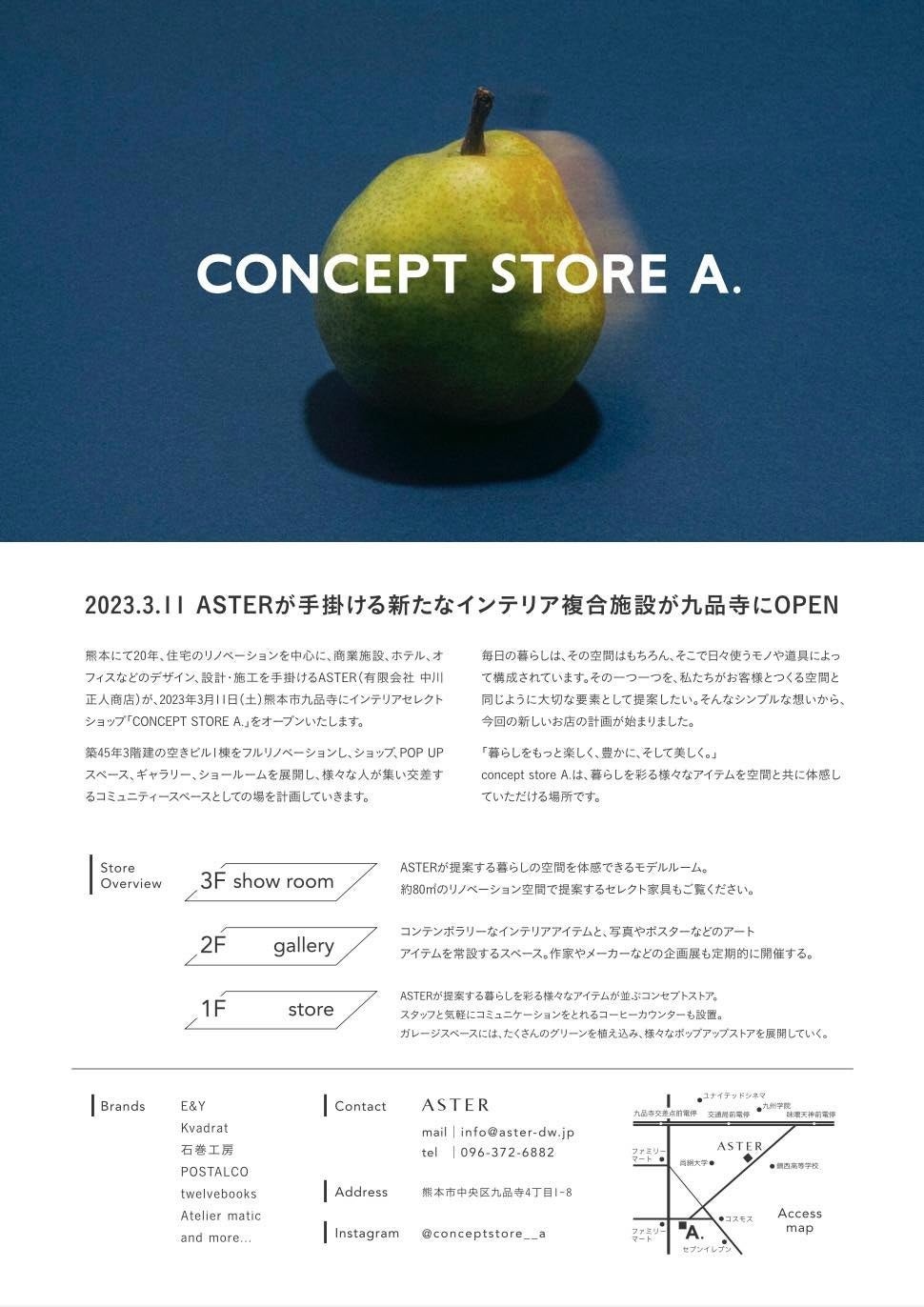 熊本にて20年、住宅のリノベーションを中心に、商業施設・ホテル・オフィスなどのデザインや設計・施工を手掛けるASTER(有限会社 中川正人商店)が、2023年3月11日(土)に熊本市中央区九品寺にインテリアセレクトショップ「CONCEPT STORE A.」をオープンいたします。