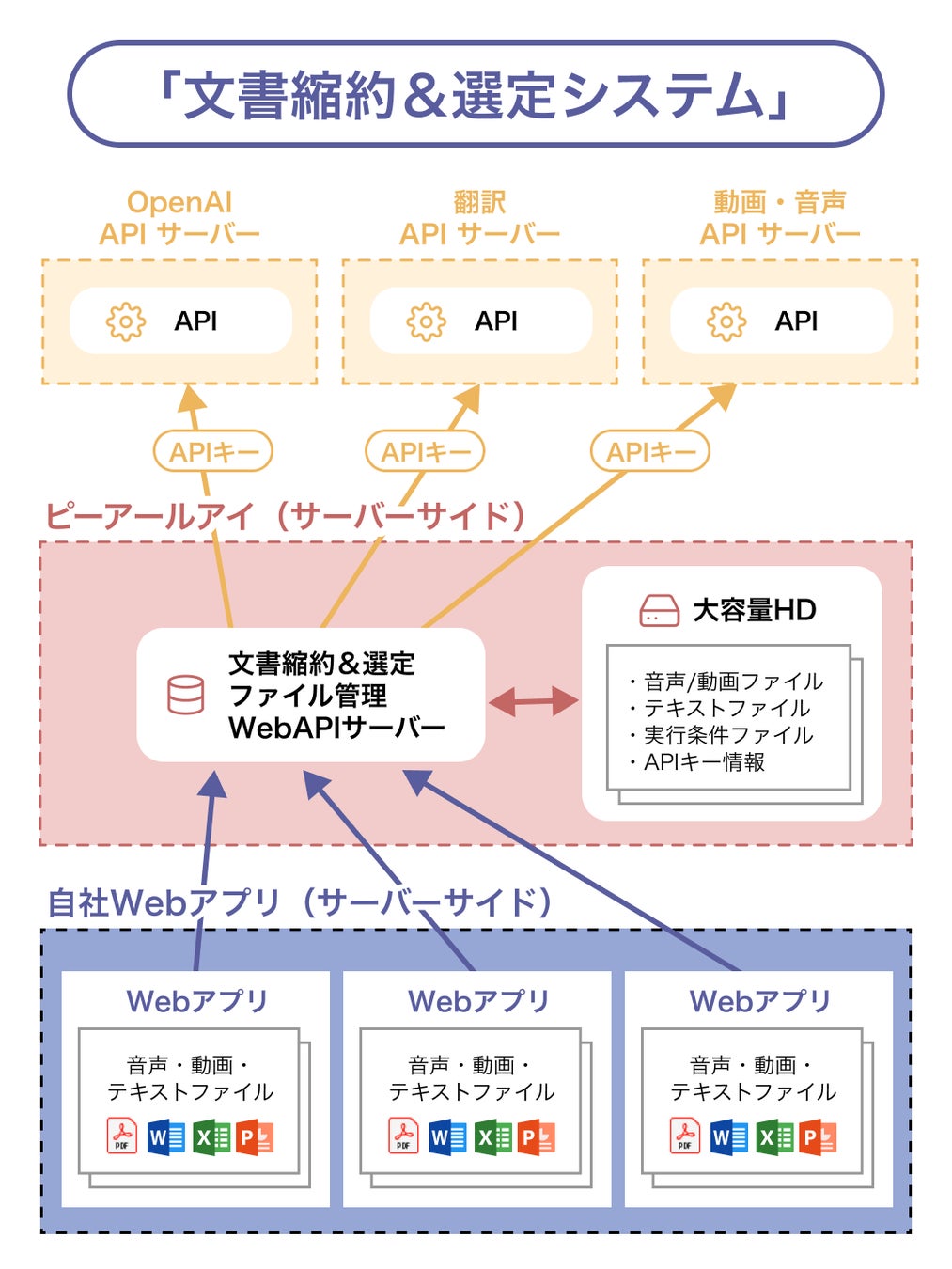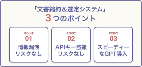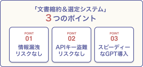 株式会社ピーアールアイの開発した「文書縮約&選定システム」では、追加学習した内容を大規模言語モデルに学習させない有料版のChatGPT APIのみを用いることで情報漏洩のリスクを回避します。