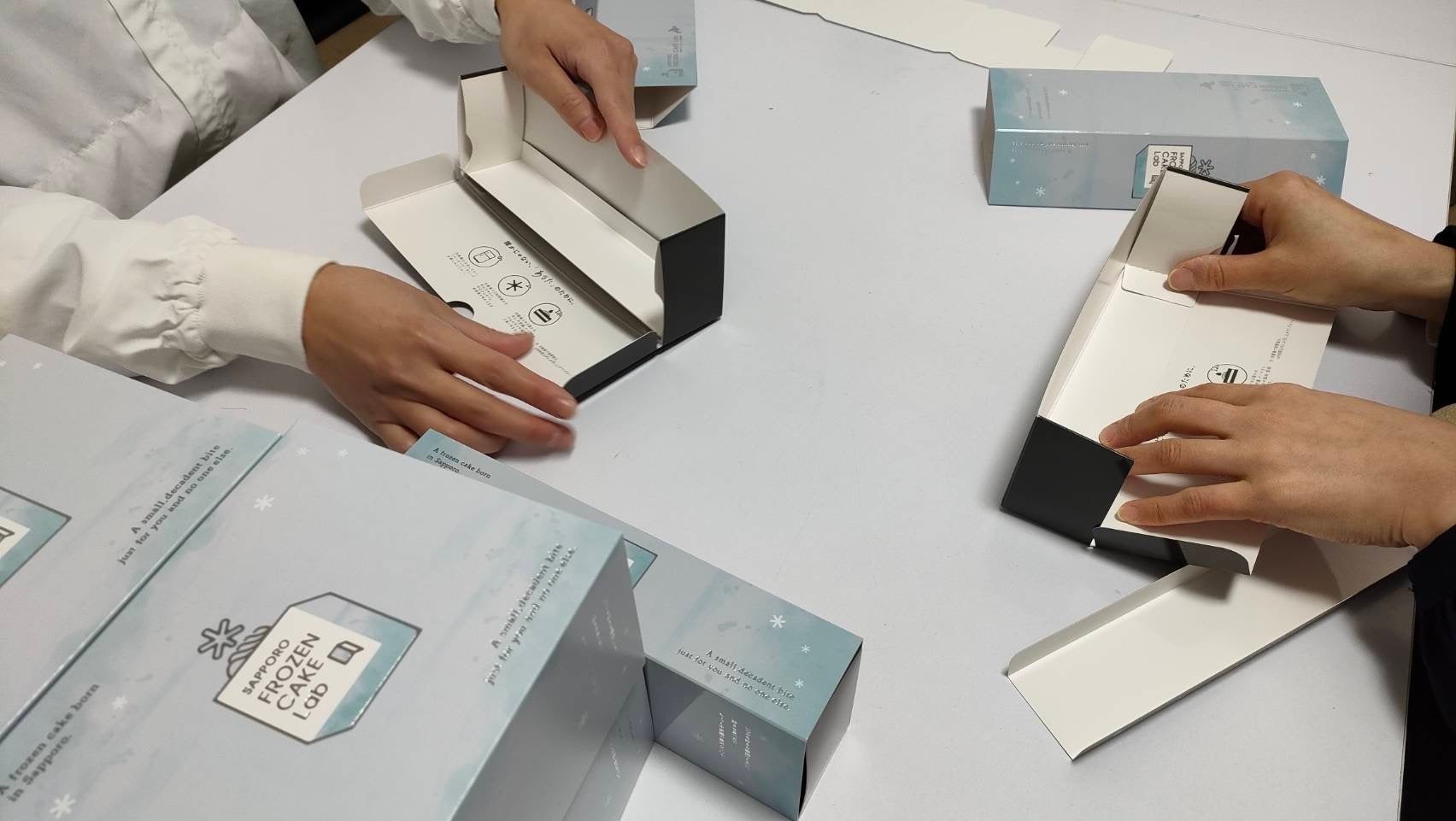 ケーキを入れる箱折り作業や箱や袋に貼るシール貼り作業を
