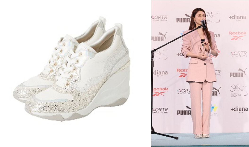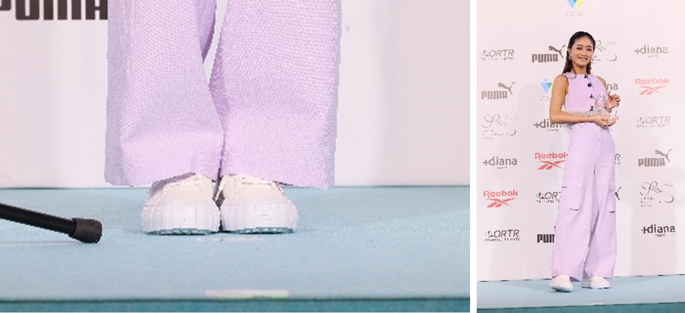 横田真悠さんは、「スニーカーは物心ついた頃から近くにあった存在ですし、本当にスニーカーが大好きで、毎日履いていたので、このような賞をいただけて本当に嬉しいです。」と喜びを顕にしました。当日着用したスニーカーについて、履き心地を聞かれると「厚底とは思えないほど軽くて、丸みのあるフォルムが女性らしさもあって素敵ですし、メタリックなラインが、動くとキラキラして素敵です。」とコメントしました。