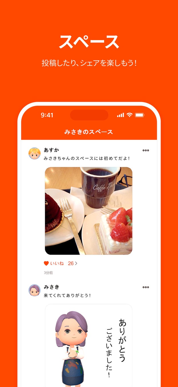 「スペース」は友達同士における掲示板のような役割で、チャットメッセージでのやりとりとは異なり、お互いの情報共有を行う場になります。一方で、スペースに投稿された内容に興味を持ちやり取りを行おうとする場合には、投稿をチャットに引用し、友達と会話につなげることができます。