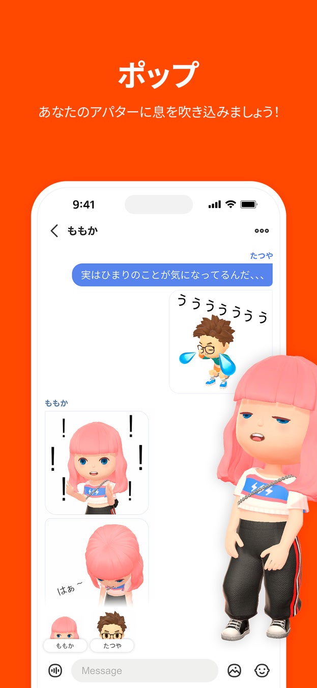 「ポップ」はBagelの一般的なチャット機能におけるスタンプを指します。ポップはすべて自身のアバターを通じたモーションステッカーとなっており、デフォルトで用意された「喜び」「悲しみ」「怒り」などの様々なモーションが自身のアバターで表現できるため、多様な感情表現をすることができます。また、用意されたモーションに留まらず、実際の自分の動きをキャプチャーしたオリジナルのポップを作成・送信することも可能です。