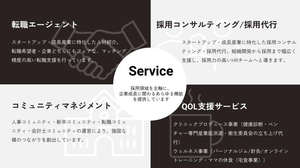 スタートアップ・成長企業に特化した人材紹介。転職希望者・企業どちらにもフェアな、マッチング精度の高い転職支援を行います。