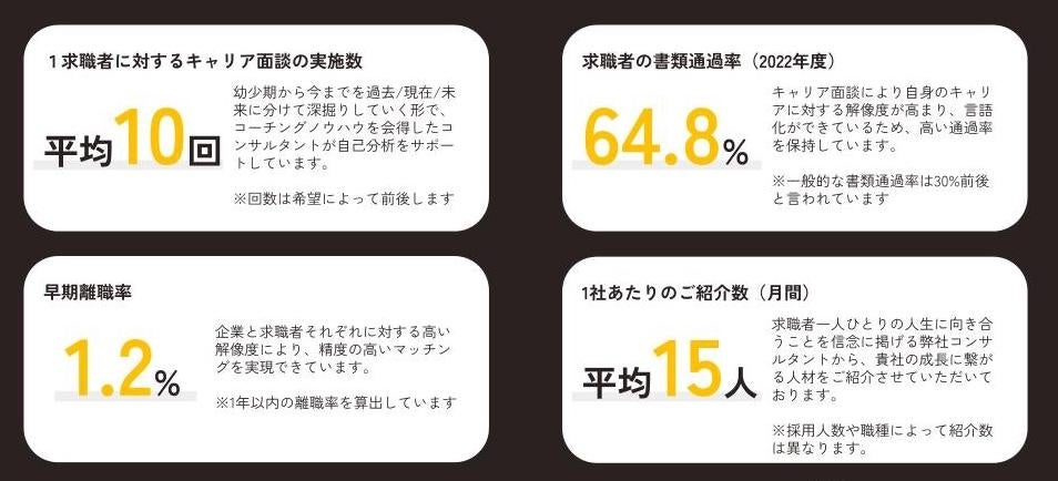 担当するコンサルタントは全員共通でコーチングのノウハウを会得しています。平均10回ほど行う面談のなかで、多角的な質問や思考のフレームワークを活用し自己分析を伴走することで、求職者が万全な状態で面接に臨めるようサポートします。