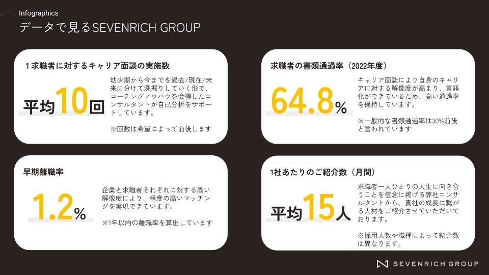 SEVENRICH GROUPは会計事務所からはじまったグループ企業。その知見は、株式会社BOXにも受け継がれ、ファイナンス・人・サービス・マーケットなど様々な角度から企業を分析します。集積された情報を転職希望者にお伝えするため、高いマッチング精度を実現でき、選考通過率は非常に高く、入社後のミスマッチもほとんど発生しません。