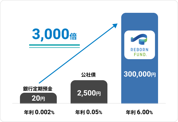 例えば、銀行に定期預金(500 万円) を寝かせていた場合と、リボーンファンドに出資した場合、1 年後はどうなるのか?のシミュレーションです。銀行預金の利息0.002% 前後とした場合、3000 倍の分配金を受け取れる可能性があります。(想定6% で運用した場合)