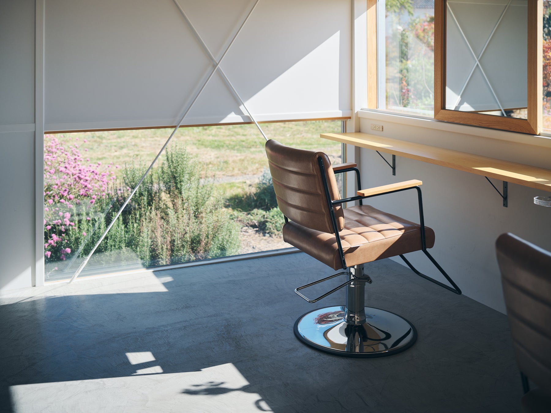 リノベーションは、オリジナル空間の性格を綿密に読み解かねば、表層的なデザイン改築の域を出ない。ここでは、既存の外壁下地胴縁をデザインの下敷きとし、それを基準に外壁をくり抜き、家具を組込み、スライドする可動の鏡を胴縁間につくりこんでいる。簡単な操作の積み重ねに見えるが、このデザインコードの発見が、単なる倉庫を美容院らしい洒落た空間へと生まれ変わらせている。