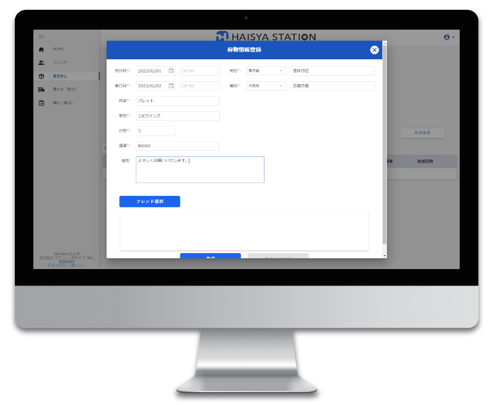 「新規登録」から荷物情報を入力し、送信したいフレンドを選んで情報送信することで傭車を探します。複数のフレンドを選択して同時に送信することができ、アナログ通信よりも格段に伝達効率が良くなっています。送信相手の集団ごとに条件を変えることができるので、傭車さがしの効率化と利益率の向上を両立させることが可能になります。