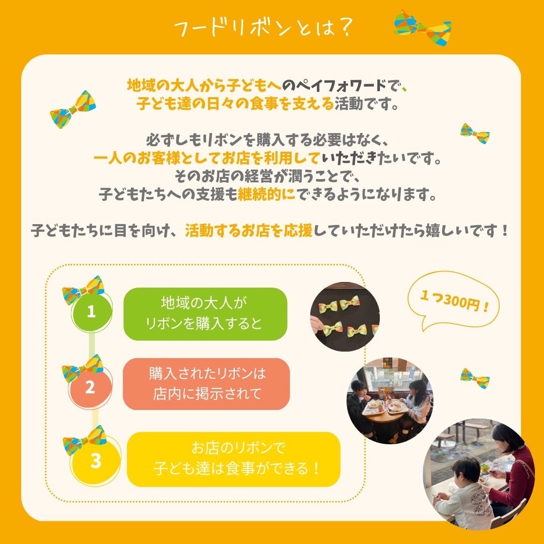 一般社団法人ロングスプーン協会(代表:橋本展行 千葉県市川市塩焼4-10-3-711)は、飲食店による新しい子ども食堂の形として「フードリボンプロジェクト」を全国に展開しています。当プロジェクトは、1つ300円のリボンを使って子ども達の日々の食事を支えるスキーム「フードリボン」の導入・実施を、全国の飲食店に推進する取り組みです。(フードリボンの金額は社会情勢によって変動する場合があります)