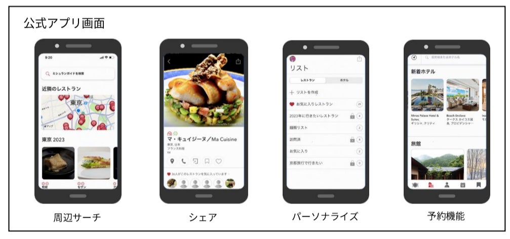 ミシュランガイドアプリには、施設の情報や調査員のコメントなどが掲載されています。現在、37カ国からレストラン16,200 軒、120カ国からホテル6,000軒のミシュランガイドセレクションを検索、予約※2することができ、ユーザーの皆様のグルメや旅の体験をよりシンプルに、スピーディーに実現します。日本のレストランの予約機能は順次スタートする予定です。※2 ミシュランガイド公式ウェブサイトでは4月27日から一部開始