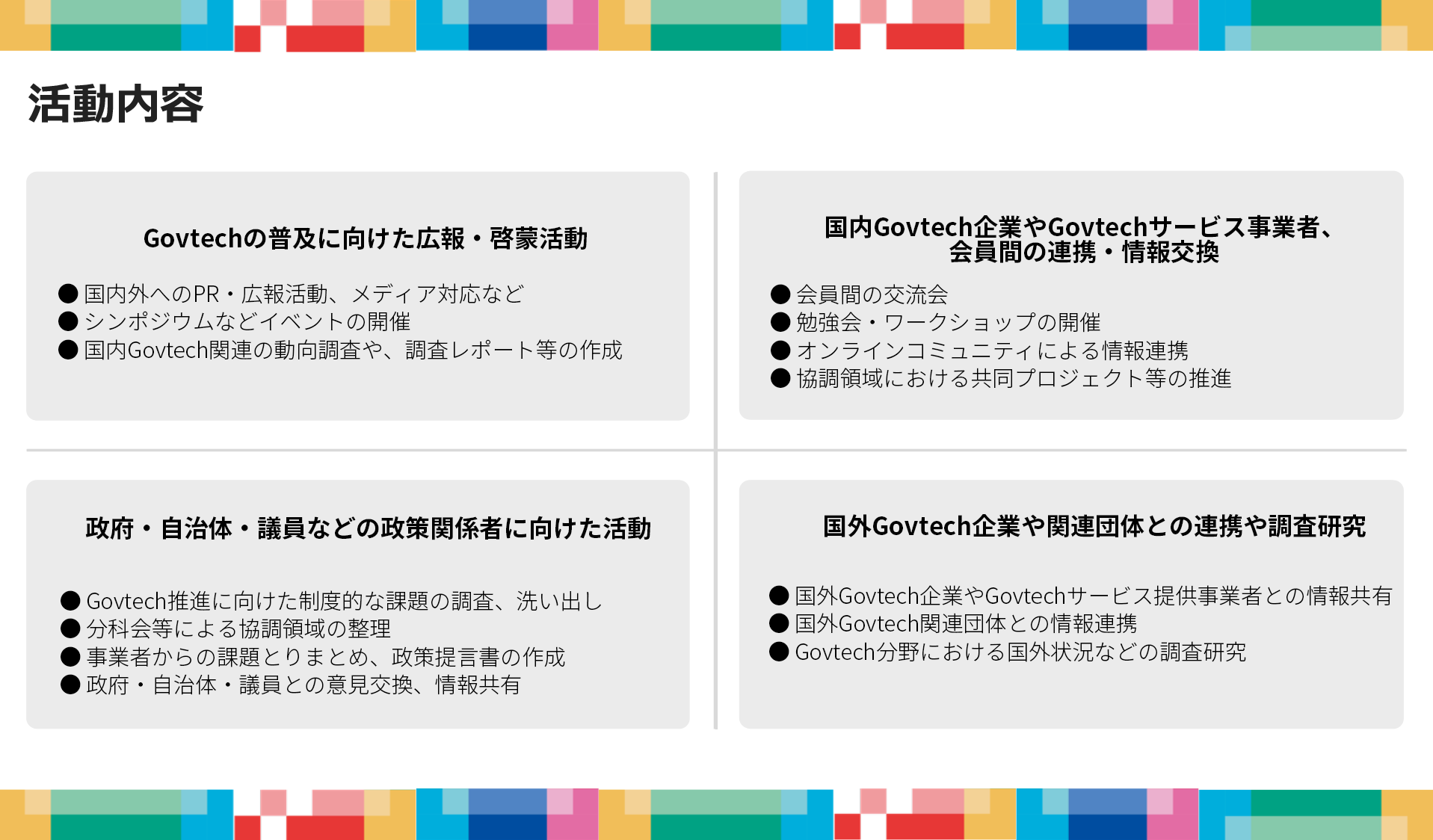 Govtech協会では、Govtechの推進を通して、多様でオープンな官民の関わり合い、公共・行政分野に新しい文化が生まれることで、誰一人取り残されない、人に優しいデジタル社会の実現に貢献できると考え、公共・行政分野のデジタル化を推進する当事者を増やし、民間企業による革新的なGovtechサービスが生まれやすい環境や制度、共創・競争環境の整備を推進します。
