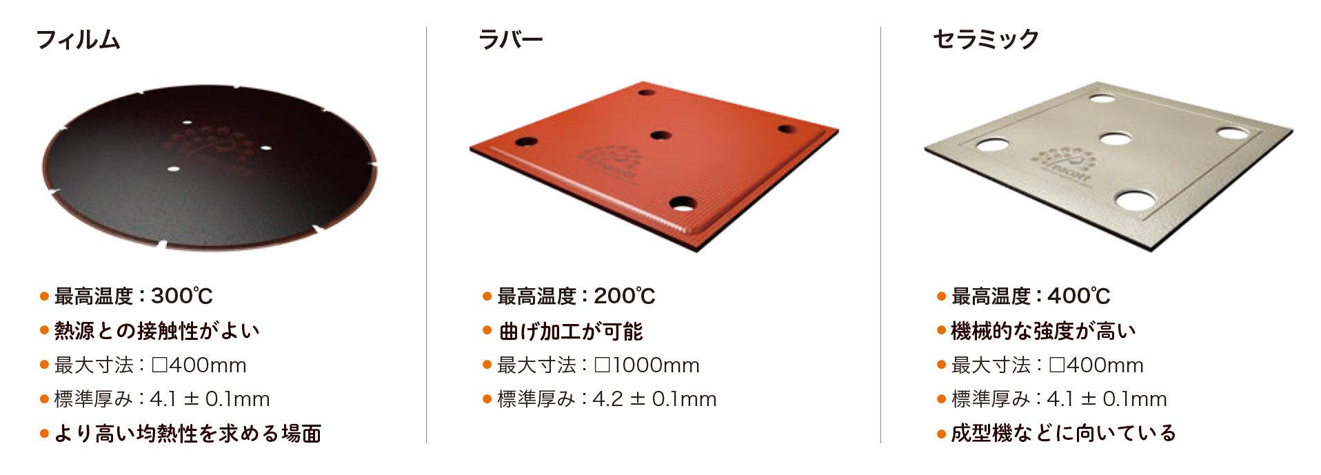 ※弊社開発のヒーター(フィルムヒーター・高温用面状ヒーターなど)と合わせてお使いいただくことで、さらに均熱効果を高めることができます。クライアント側の製造設備の仕様に合わせたオーダーメイドも可能です。