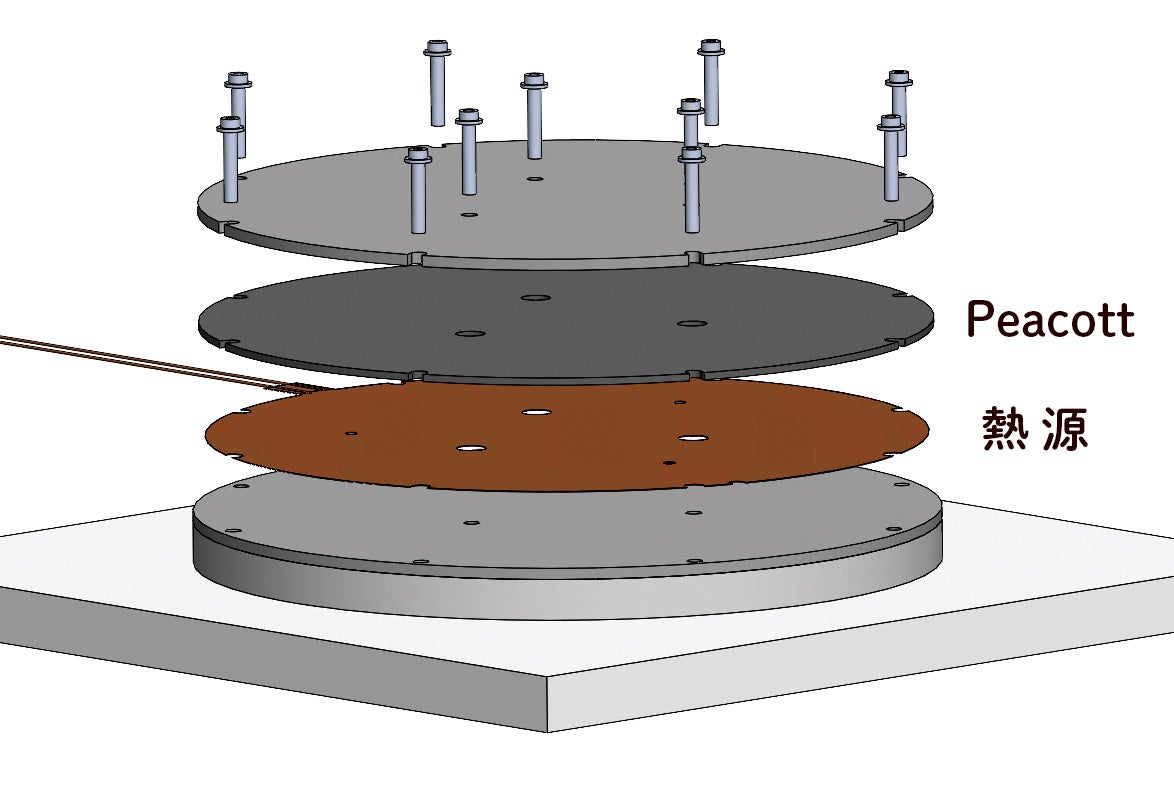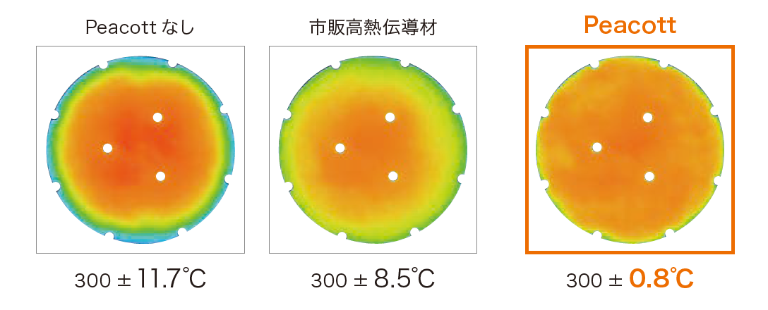 「Peacott(ピーコット)」は、ヒーターとの相性が良い高熱伝導材に、私たちが独自開発した特殊加工(特許出願中)を施すことで、温度のコントロール性と取り扱い性を両立したヒーター用アクセサリー。半導体の微細化に伴い、より高品質・高精度が求められる半導体製造装置メーカーからの均熱ニーズに応えて開発いたしました。用途にあわせて、最高使用温度やサイズといった仕様、用途の異なる「フィルム」「ラバー」「セラミック」の3種類を開発いたしました。
