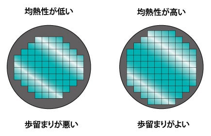 シリコンウエハーは絶縁や表面の保護のために酸化膜やフィルムを熱圧着する工程があり、この「Peacott(ピーコット)」を使用し、円盤形のシリコンウエハー全体に短時間で均一な加熱を施すことで、以下のイメージ図のように歩留まりが改善され、生産効率を向上させることができます。