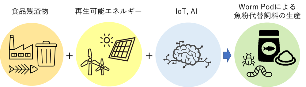 研究開発する「Worm Pod」は、コンテナタイプのコンパクトな装置で、IoTやAI、再生可能エネルギーによる高度な自律機能を備えており、遊休地を活用した持続的なミルワームの育成が可能です。内閣府ムーンショット計画目標5「2050年までに未利用の生物機能等のフル活用により、地球規模でムリ・ムダのない持続的な食料供給産業を創出」することに根差しており、消費地の近郊で原料となる昆虫を生産することで、(主な魚粉原産国であるペルーと比較した場合)フードマイルを従来の1000分の1以下に抑えることが可能となります。