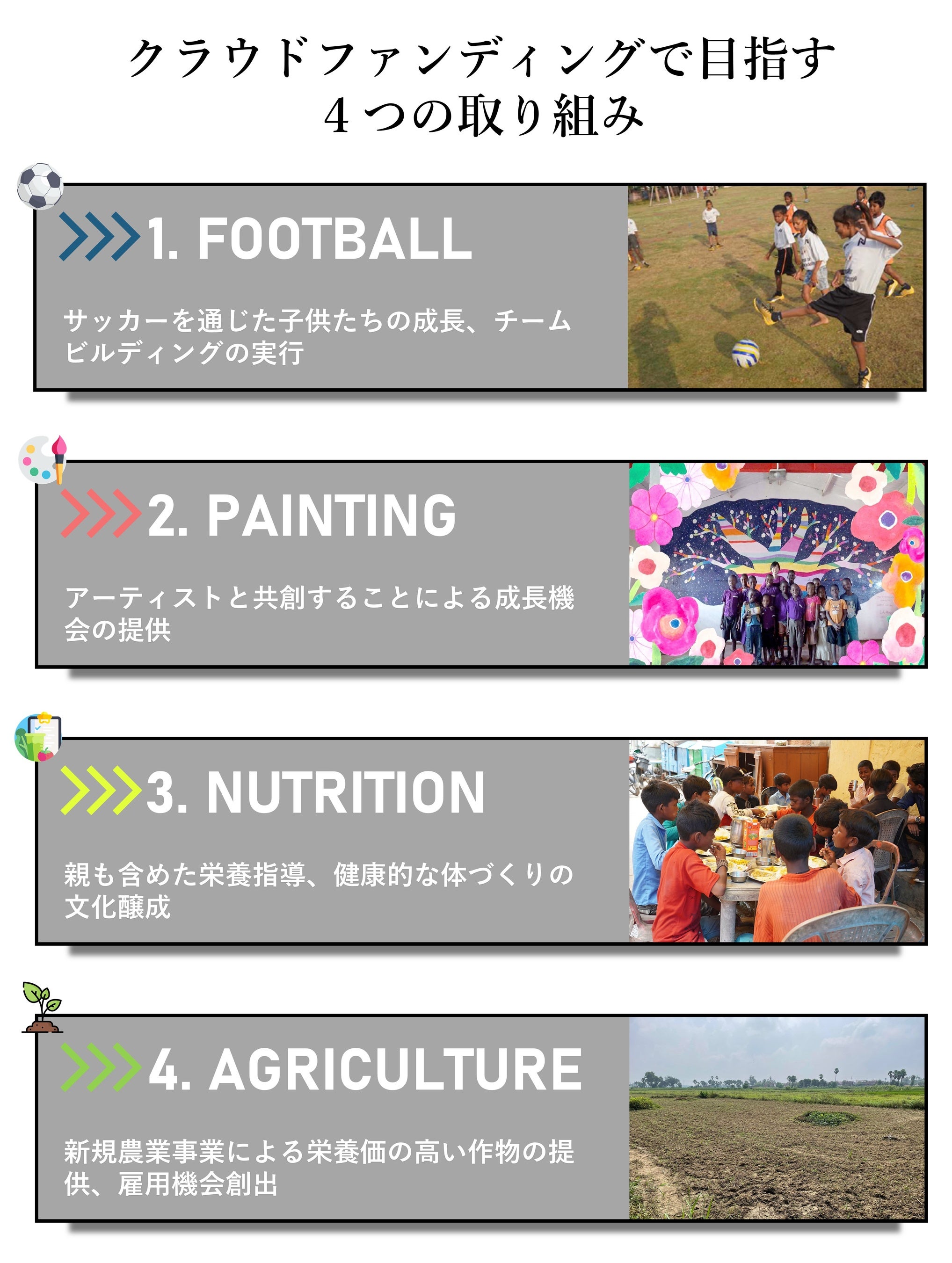 今回のクラウドファンディングでは、「サッカー」を軸に「教育」「栄養」「雇用」という4つの切り口から、インドの子ども達の明るい未来にむけて、ビハール州では初となる以下プロジェクトに取り組みます。