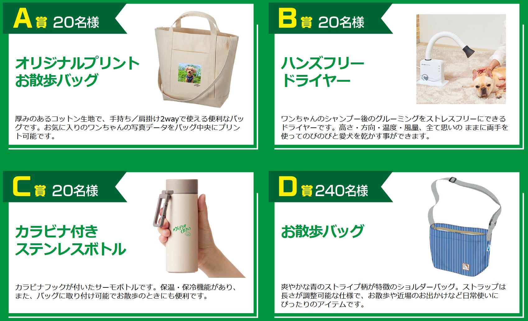 ワンちゃんが色々なことにイヤイヤする動画を、Instagramまたは特設サイトの応募フォームから投稿していただいた方から抽選で計300名様に、飼い主様とワンちゃん両方がうれしい素敵なグッズをプレゼントします。
