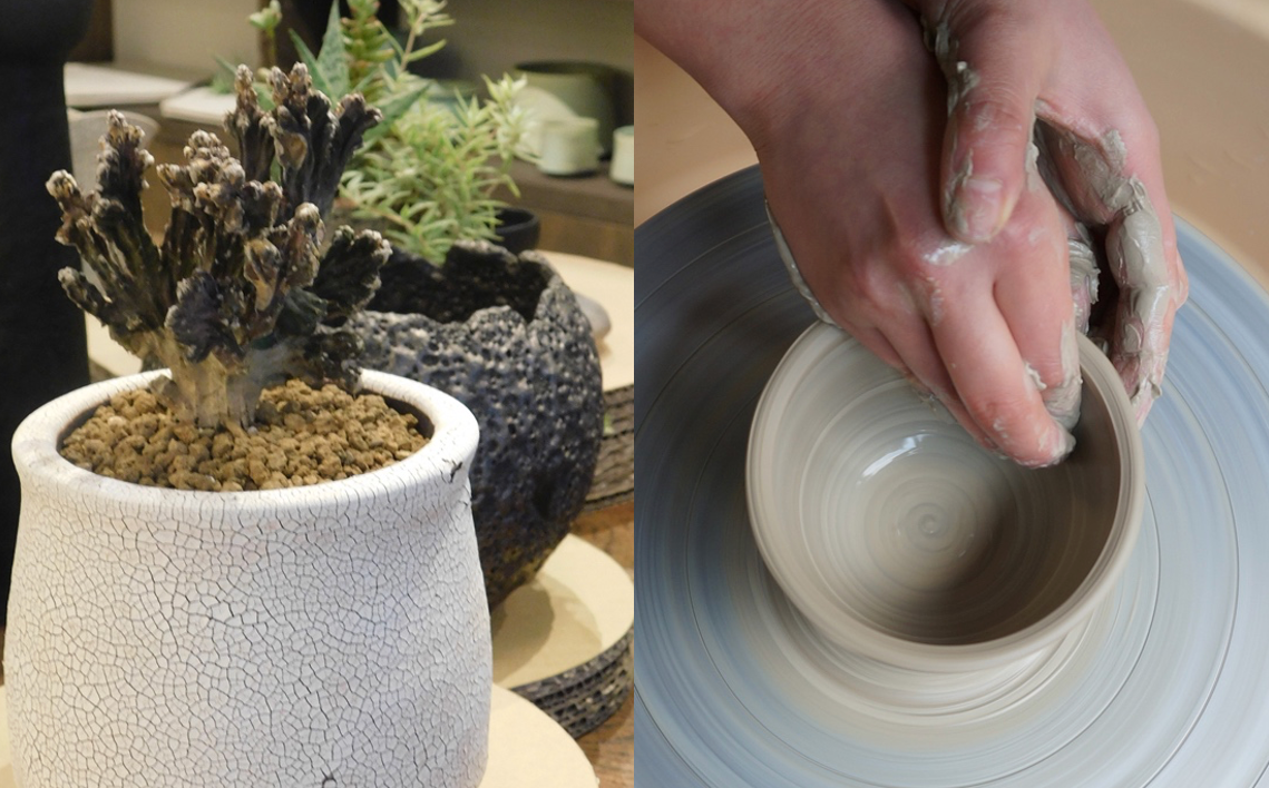 五感を刺激するインテリア空間の構成要素の一つである植物と、美濃の陶作家、窯元によるうつわと花器をご用意しております。