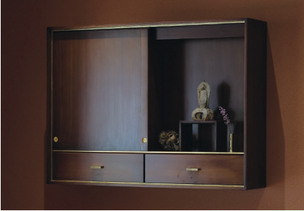 現代の暮らしに馴染むように、壁付けかつ、奥行きを浅くすることで量感を抑えている。飾り床+棚としても使用できる。木目を生かした拭き漆とすることで、木地職人と漆職人の技を際立たせる。引き出しの取手は無垢真鍮の削り出し。