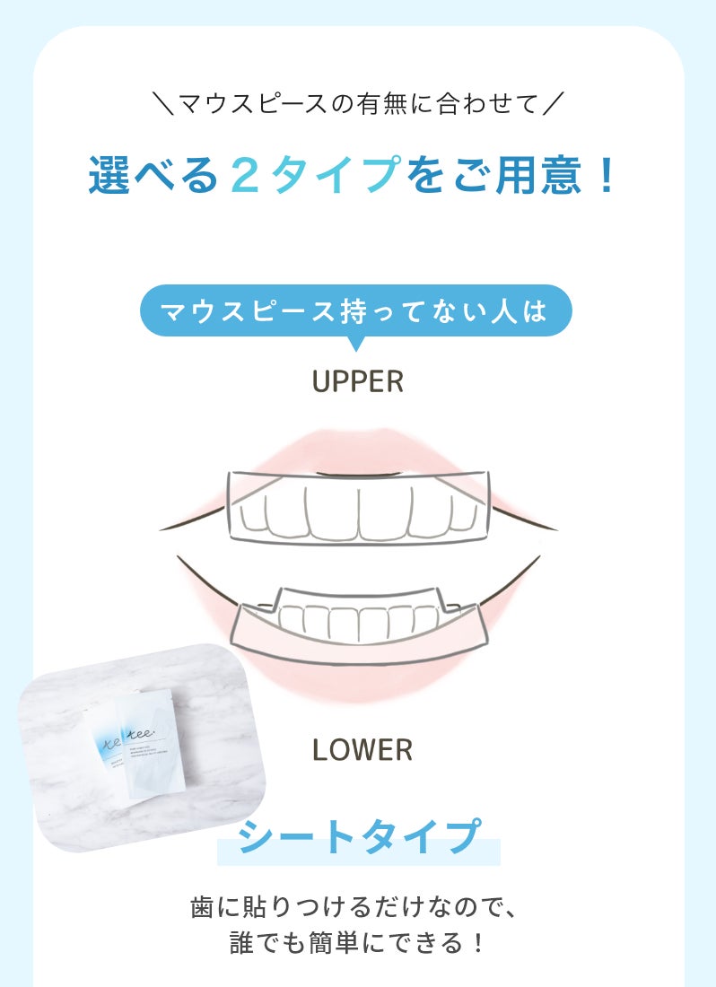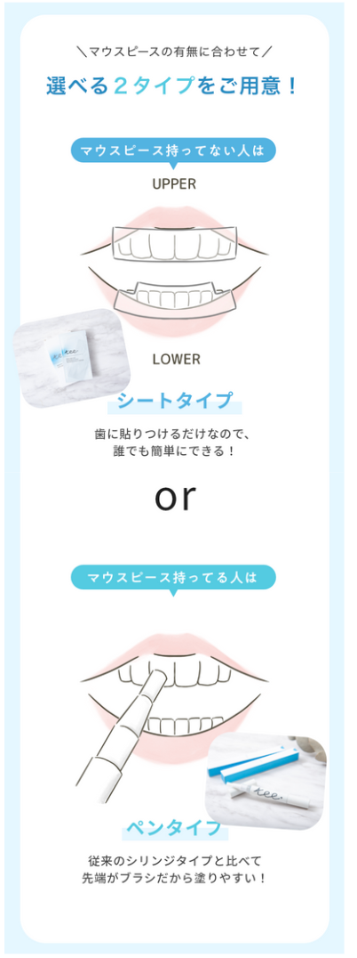 従来のホームホワイトニングでは専用のマウスピースが必要ですが、teeでは2種類お選びいただけます。マウスピースをお持ちの方はペンタイプ、マウスピースをお持ちでない方はシートタイプです。従来のシリンジタイプ(注射器のような形)は、毎回マウスピースにジェルを入れる作業が面倒との声から、ペンタイプにすることにより歯に塗るだけでより手軽にできるようにしました。シートタイプは国内で歯科医院から処方されるケースは少なく、マウスピース不要の手軽さから今後確実に普及していくと考えています。