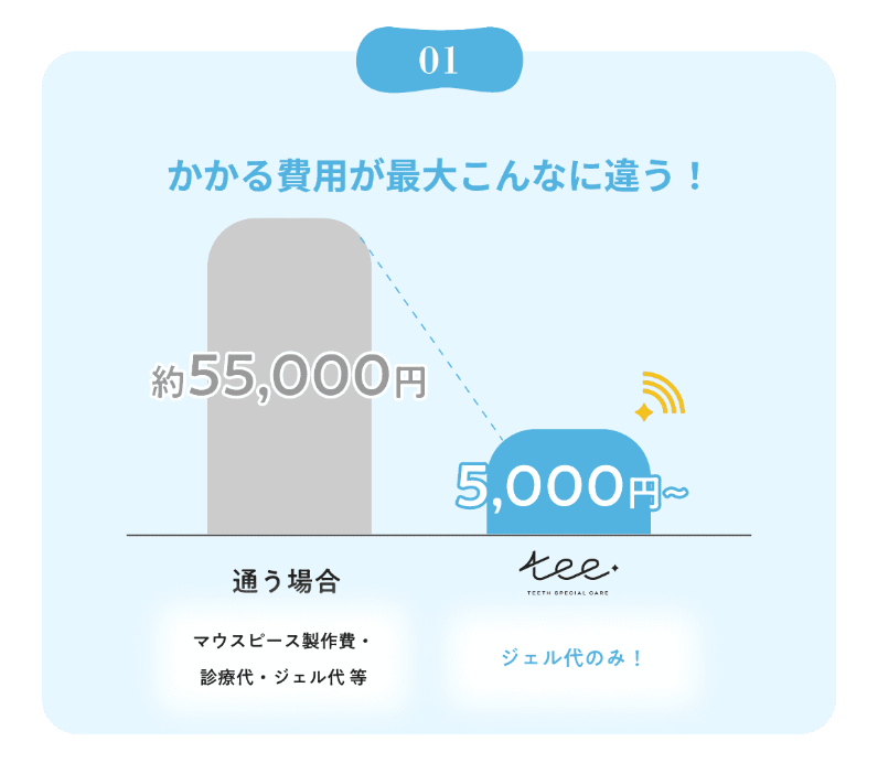 最短1分のオンライン診療と1日わずか30分のホワイトニング。スマホしながらでも可能です。またホームホワイトニングの相場の約2万円~5.5万円に対して、teeの場合は通わなくて良いので月々10,000円〜の手頃な価格から始められます。