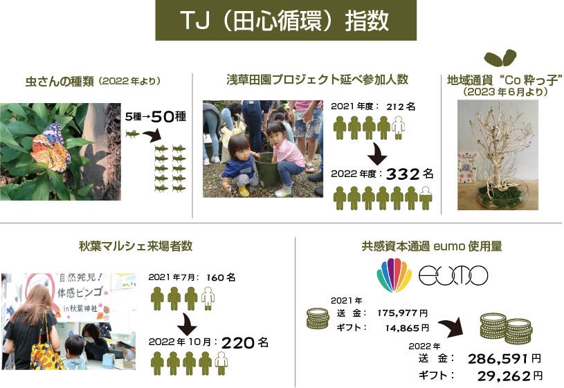 活動を通して、プロジェクトの参加者数や秋葉神社の虫の数の増加等、様々な変化がありました。こうした目に見えない関係性やつながりを表すものとして、「TJ(田心循環)指数」(詳細はこちら:https://hatarakuba.com/asakusa-tanbo-3/ )という独自の指標を示しています。また、具体的な子どもたちの変化として、始めは土を怖がっていた子が、活動に継続して参加する中で苦手を克服したり、自ら稲を運ぶ役割を担ったりするといった場面が見られ、周囲との関わりによって成長していく姿や、その様子を皆で喜べる人と人との関係性が生み出されていました。