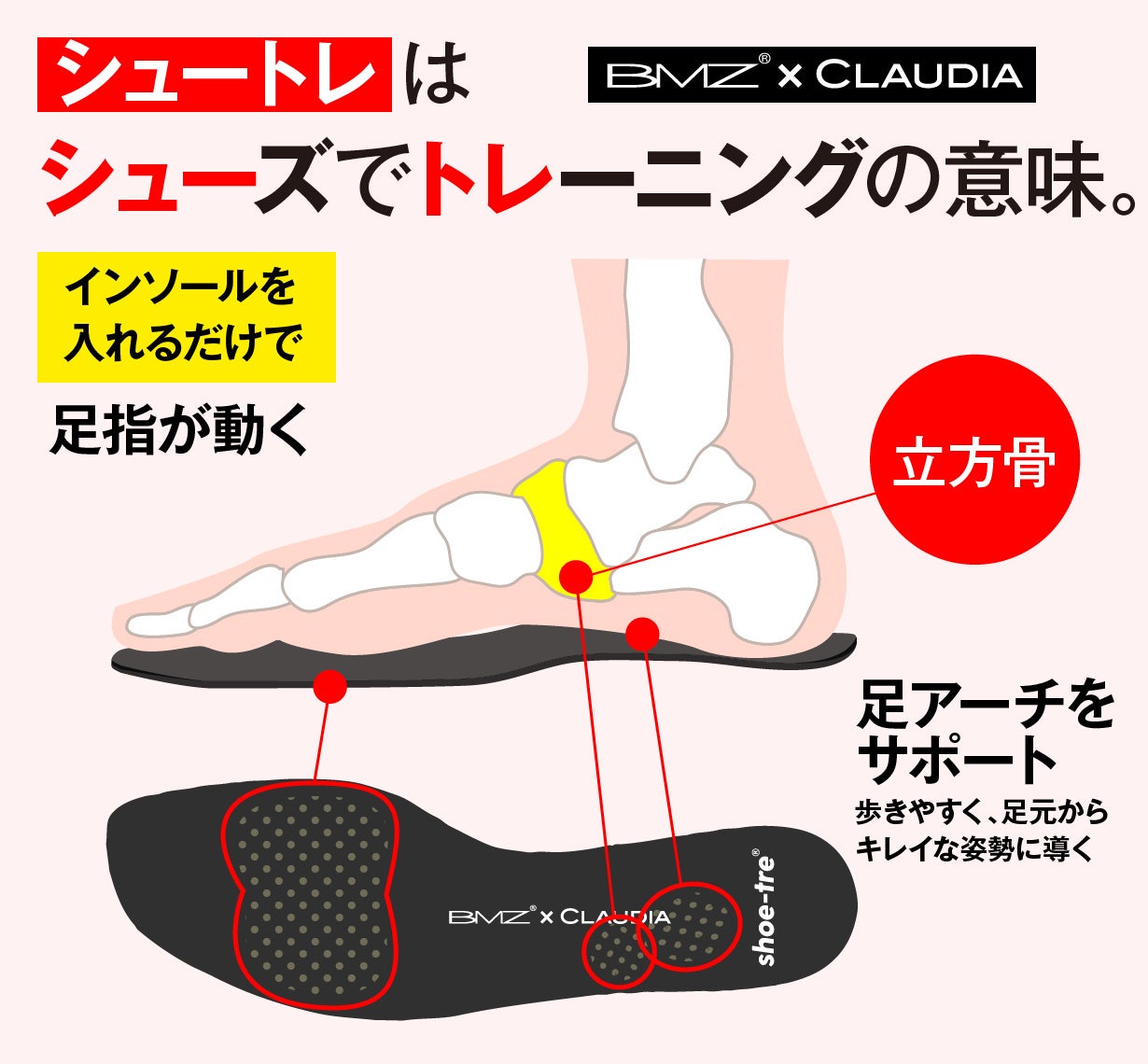 これまでインソールというと、足裏の「土踏まず」を支えることが常識とされていましたが、BMZは「立方骨」を中心に「足の骨格バランス」をサポートする考え方で特許を取得しています。