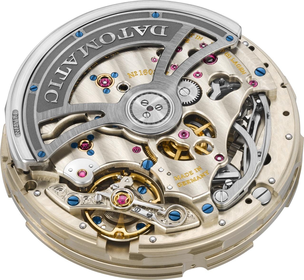 オデュッセウス・クロノグラフに搭載されているキャリバーL156.1 DATOMATIC は、A. ランゲ&ゾーネ初の自動巻きクロノグラフムーブメントです。DATOMATIC(ダトマティック)とは、ドイツ語の日付を意味する"Datum"と自動巻きを意味する"Automatik” を組み合わせた造語です"。スケルトンタイプで一部にブラックロディウム加工を施したプラチナ950製分銅付きセンターローターが、ゼンマイをしっかりと巻き上げます。香箱は、完全に巻き上げると50 時間のパワーリザーブを蓄えることができます。調速機は、歩度を最大限安定させることを考えて設計されています。その目的を達成するために、毎時28,800振動のテンプを受け板で支持しています。そのテンプ受けには、この時計が防水仕様であることと着用したまま軽い運動ができることを示唆する波模様が手彫りで描かれています。
