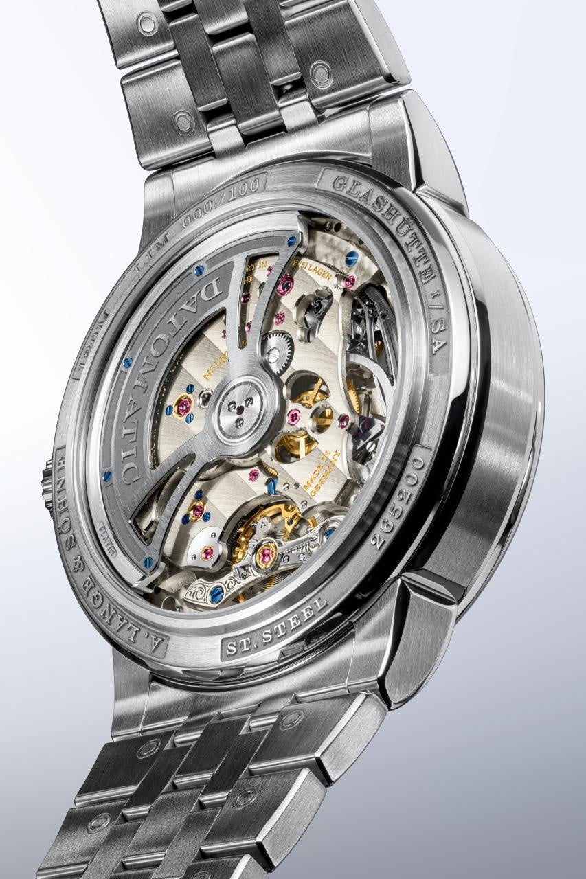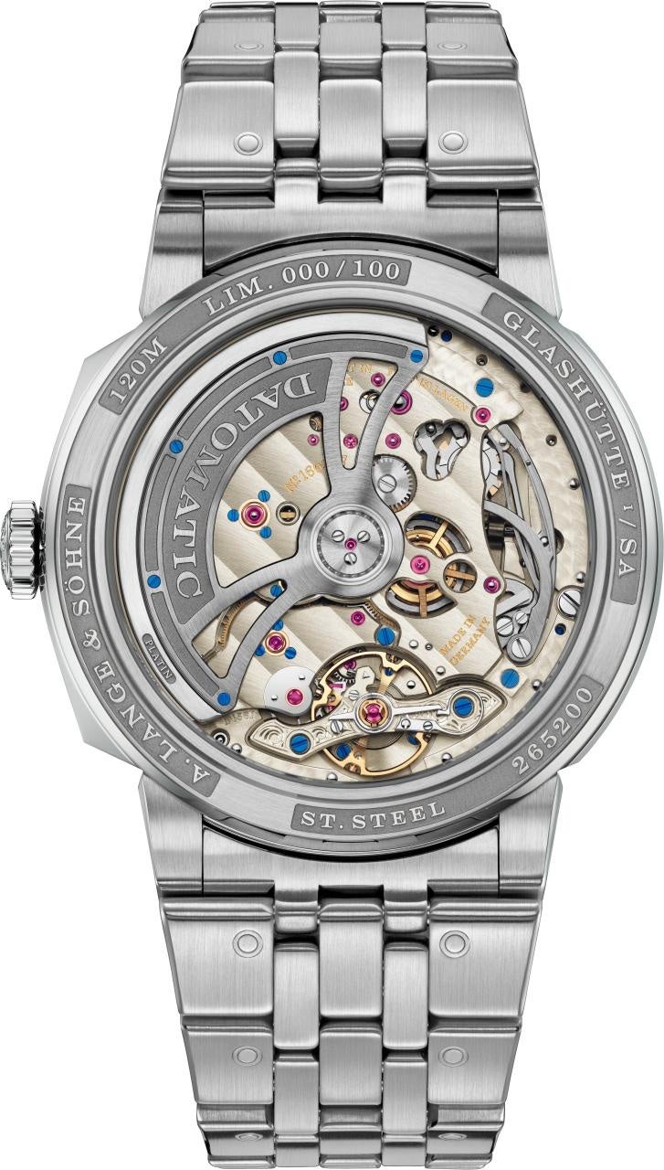 ステンレススチールケース&ブレスレット、ケース径42.5 mm、厚さ 14.2 mm、ランゲ自社製自動巻きクロノグラフムーブメント、キャリバーL156.1 DATOMATIC®(毎時28,800振動、52石、約50時間パワーリザーブ)巻上げおよび時刻調整用ねじ込み式リューズ/日付・曜日調整およびクロノグラフ操作兼用ボタン、120m防水、世界限定100本、価格要問合せ