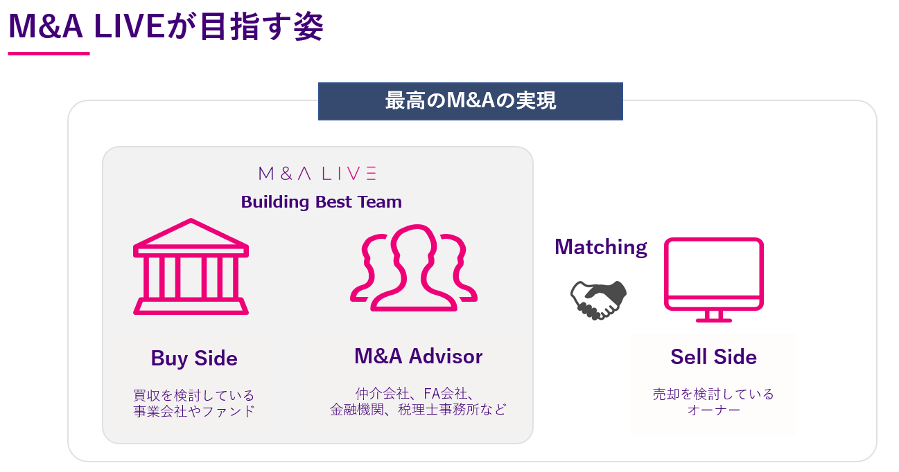 M&A LIVE株式会社は2023年3月3日に創業し、「M&A情報の配信を通じて、全てステークホルダーの架け橋となり最高のM&Aを実現する」をビジョンに、M&A買収ニーズ配信や買収戦略説明会の開催支援をはじめ、買手企業とM&Aアドバイザーを結ぶサービスを展開しております。