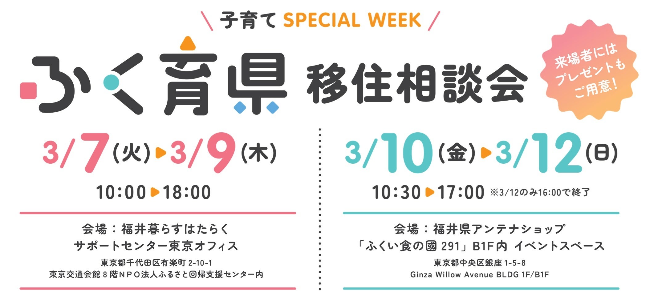 【3/7(火)~12(日)】日本一幸福な子育て県「ふく育県」! リニューアルしたアンテナショップ「ふくい食の國291」などで移住相談会を開催します。