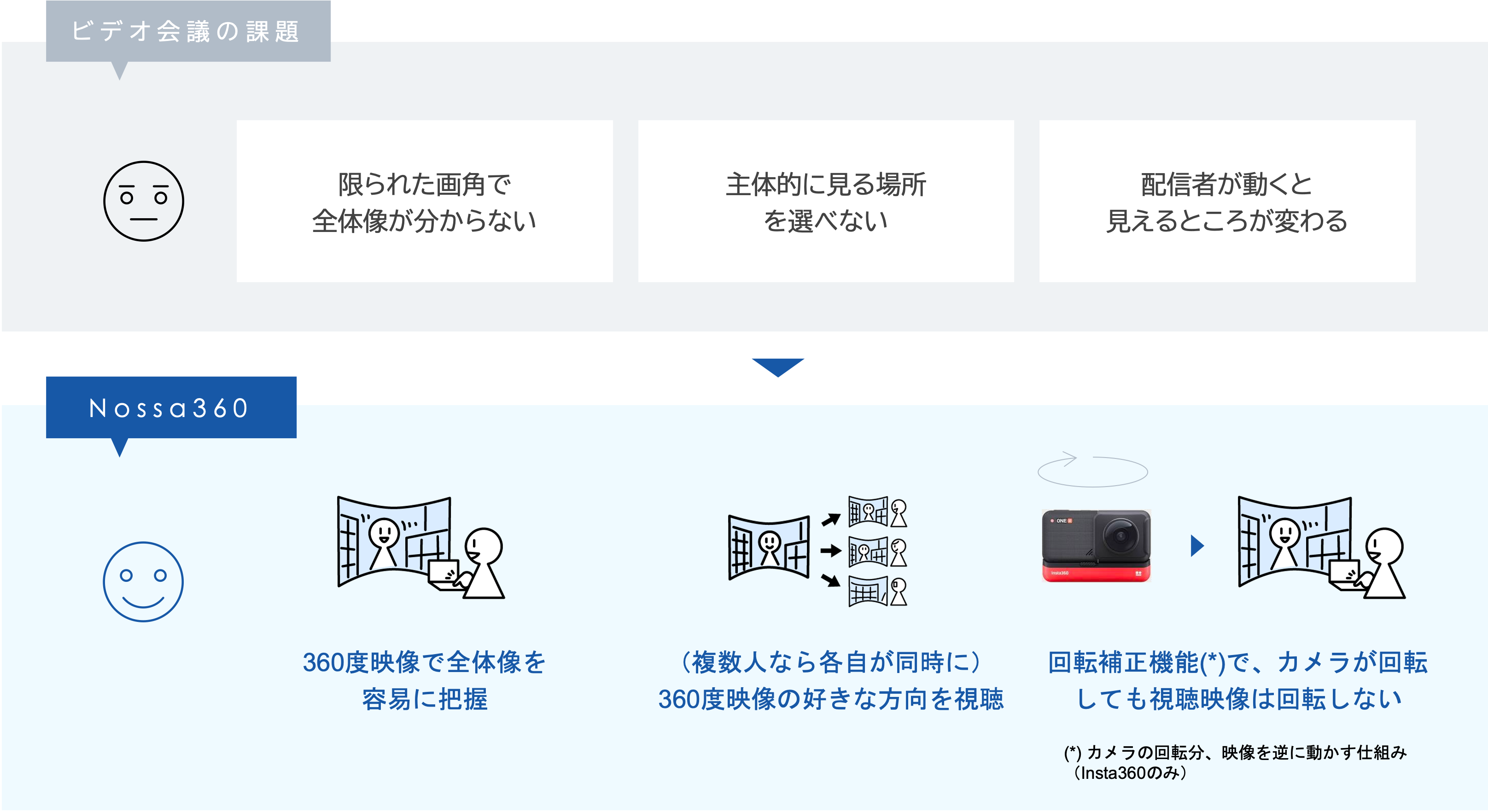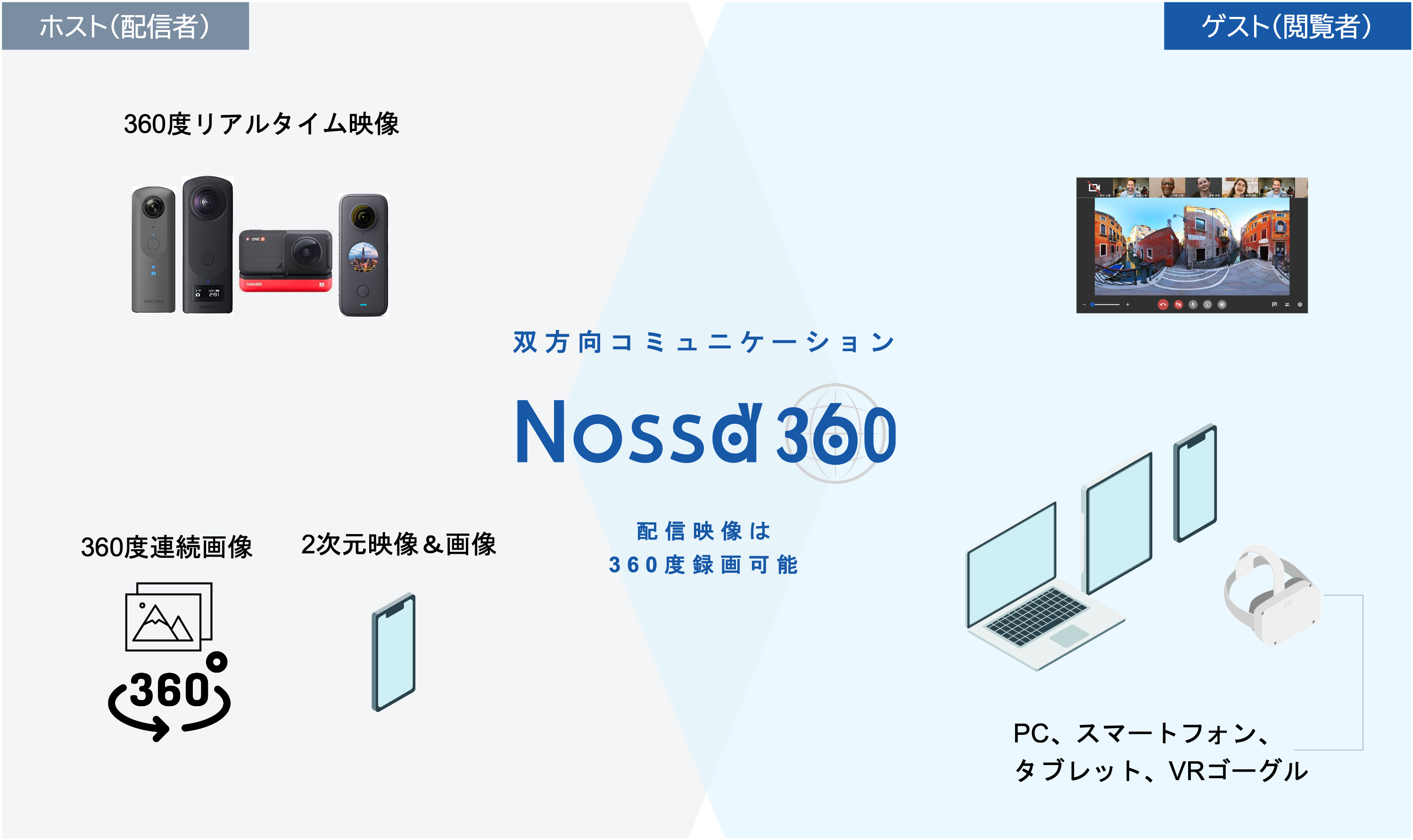 「Nossa360」は、市販の360度カメラ(*1)と組み合わせて使うコミュニケーションプラットフォームです。(サービス概要ページ:https://lp.nossa360biz.com/)