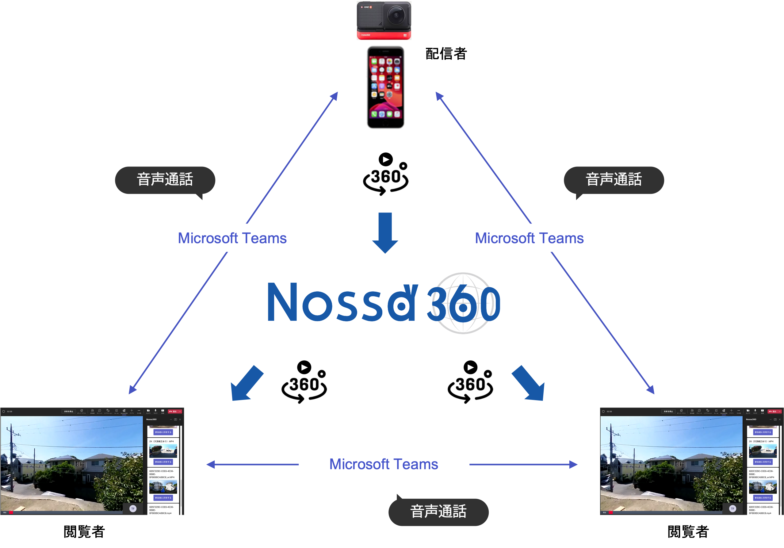 (*) 360度カメラとしてInsta360を利用する場合は、弊社が開発するスマートフォンアプリで、360度映像を配信しながら Teams 上の会話に参加可能。その他の360度カメラでは、会話への参加に別端末が必要。