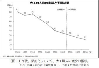 現在の日本での建設業の人手不足は深刻化しており、総務省の調査を基にしたデータによると、1980年に93万人いた大工は、2015年には35万人にまで減少しており、2030年には20万人になると予測されています〔図1〕。大工不足の最も大きな問題は高齢化であり、現在、大工の約4割は60歳以上と見られ、10代、20代の大工は1割にも満たない状況であり、住宅建築の需要ペースを上回る勢いで大工の数が減少し「家が建たない時代が来る」と言われている状況です。