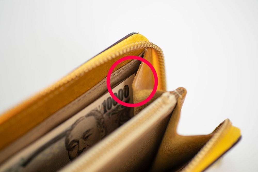 従来のラウンドジップ長財布はお札の角が折れやすいという欠点がありました。