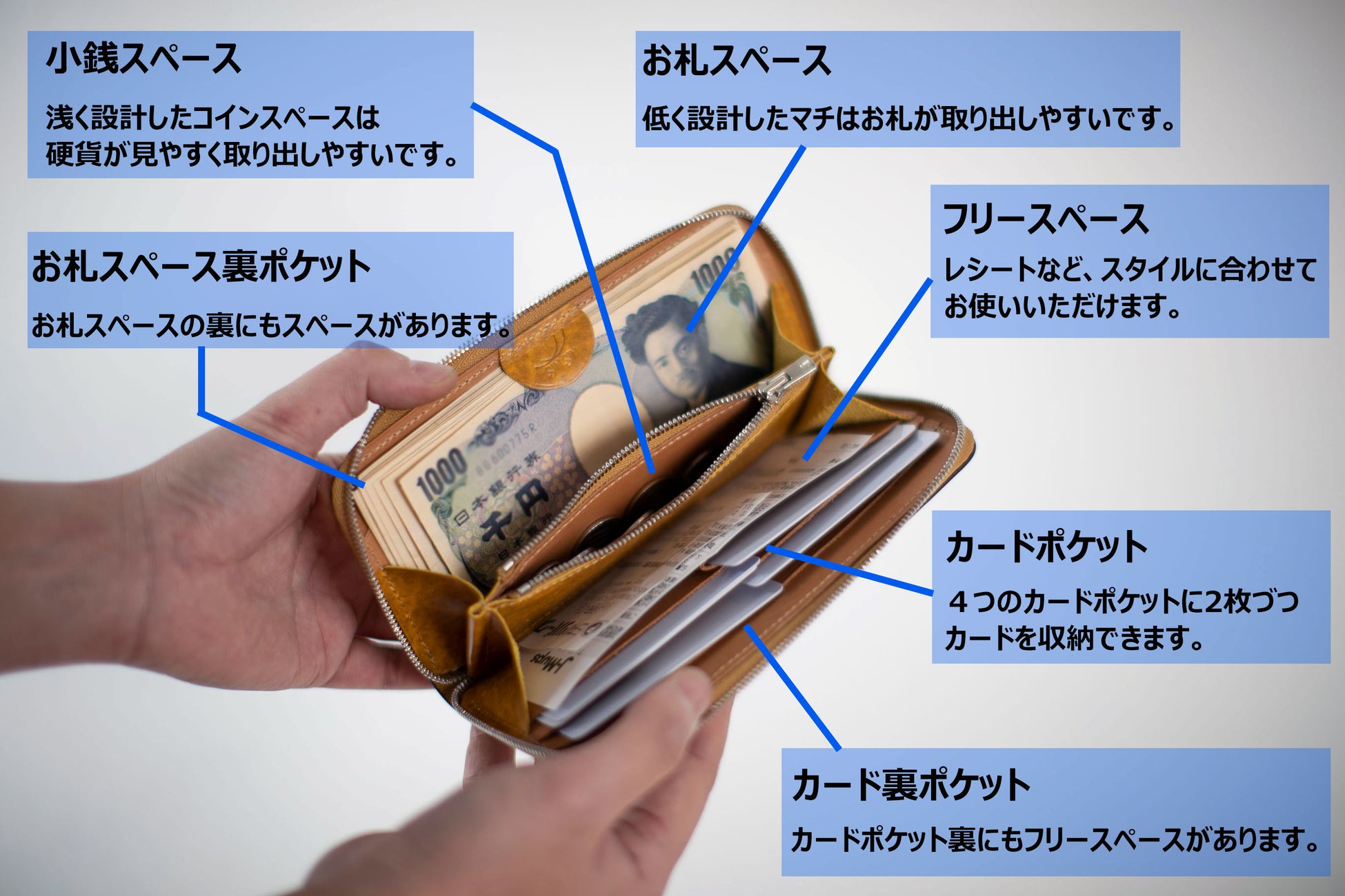 長財布の魅力は収納力です。従来のラウンドジップ長財布では無駄になっていたスペースをうまく削る事により、小さいのに大容量を実現することができました。