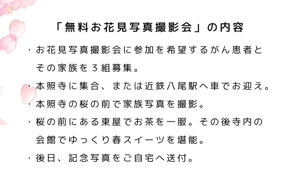 新型コロナウィルス感染症(以下、新型コロナ)のため、人の多い場所へのお出かけや楽しみをずっと我慢してきたがん患者と家族に、桜がきれいに咲く寺が花見場所を提供し、商店が春のスイーツを作り、クリニックの協力を得て、しっかりと感染対策をしたお花見写真撮影会を開催します。