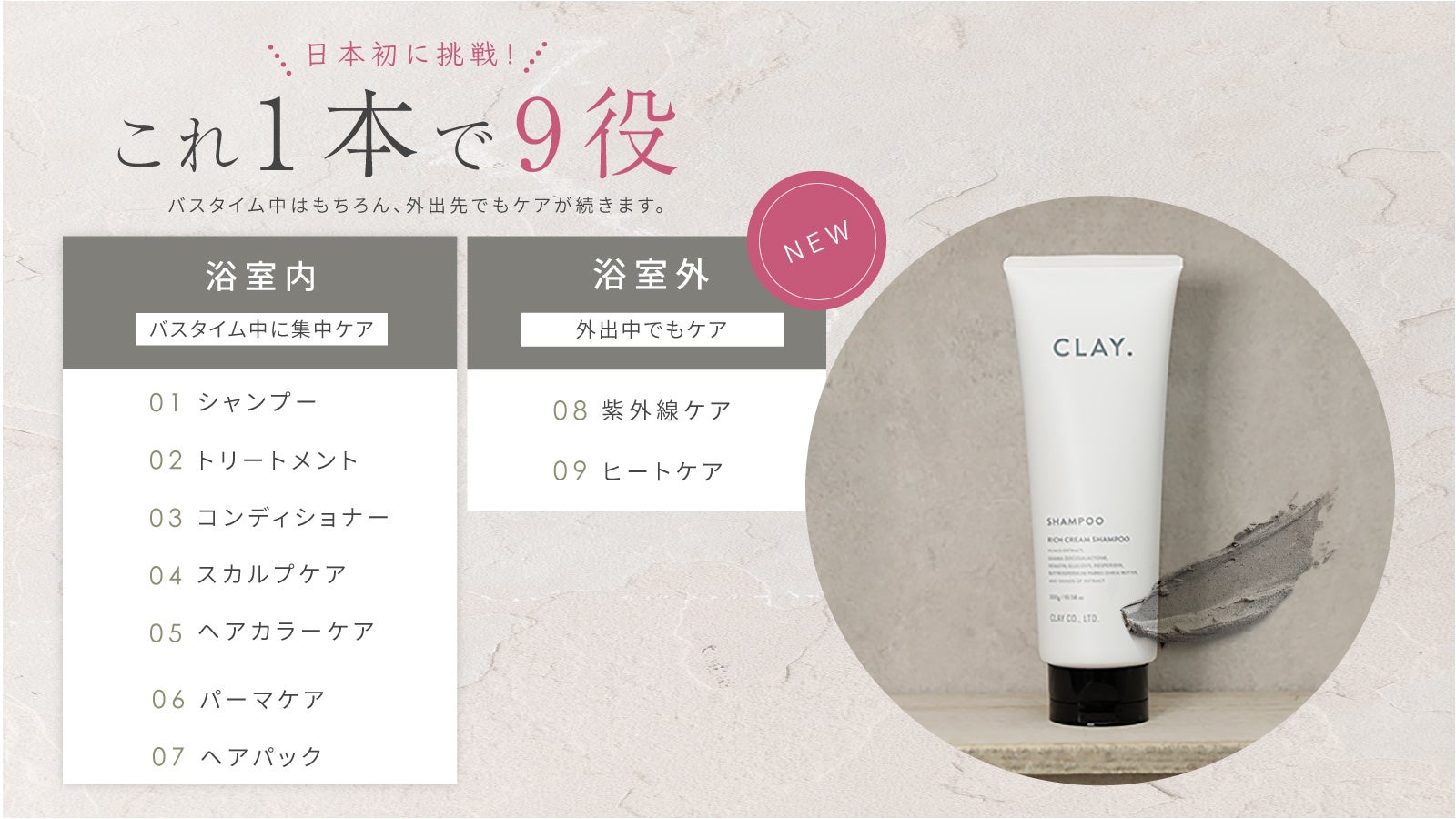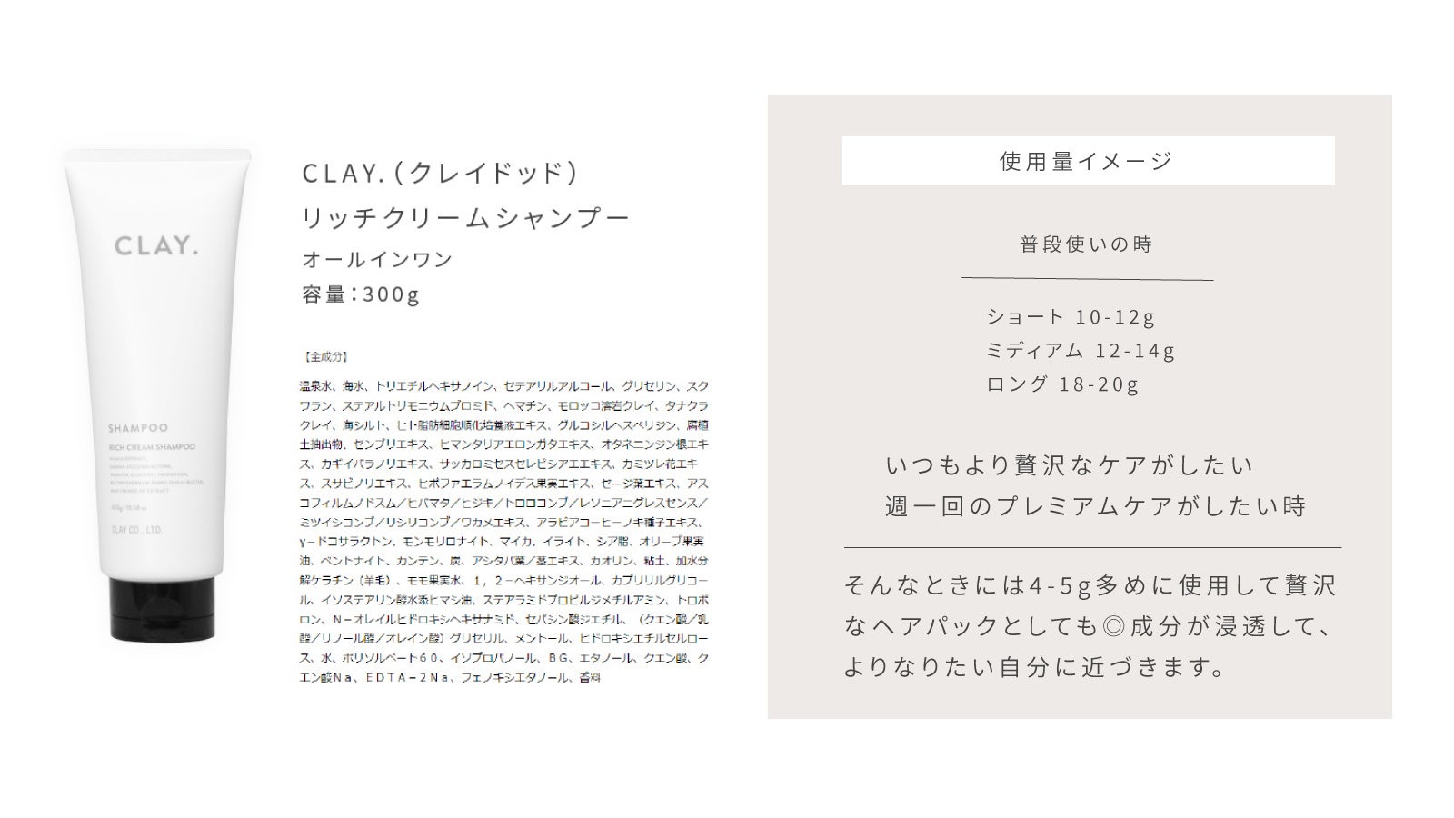 現在、多くの方が日常の多忙さ、お子様との時間や浅い睡眠や寝つけ、体調不良等多くのストレスやお悩みの中で過ごされていており、癒しの時間やグッズに強いニーズがあります。クレイ株式会社では「安定した高品質バスタイムを届けたい」想いから、CLAY.(クレイドット)ブランドを立上げ、その第一弾としてリッチクリームシャンプーを企画開発いたしました。