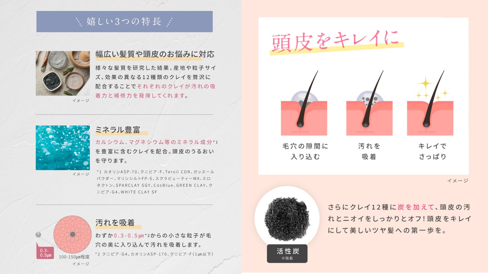 太古の地球の恵みともいえる、海のミネラルをたっぷりと含んでいるクレイ。産地や粒子の大きさ、効果のそれぞれ異なるクレイをバランス良く贅沢に配合することで毛穴の汚れ、髪の汚れ、日々蓄積される頭皮の疲れや髪のダメージにアプローチ。「落とす×補修」を同時におこなうことで洗いながら、頭皮と髪をじっくりとケアします。