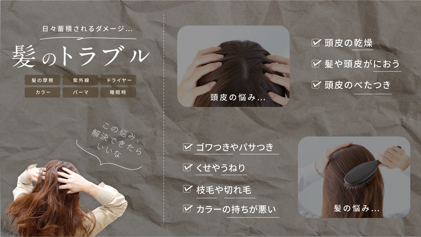 髪のトラブルは性別や年齢を問わず多くの人が抱えている、身近な悩みです。皆様のお悩みに寄り添えるようにコンセプト設計、成分設計をおこなっております。