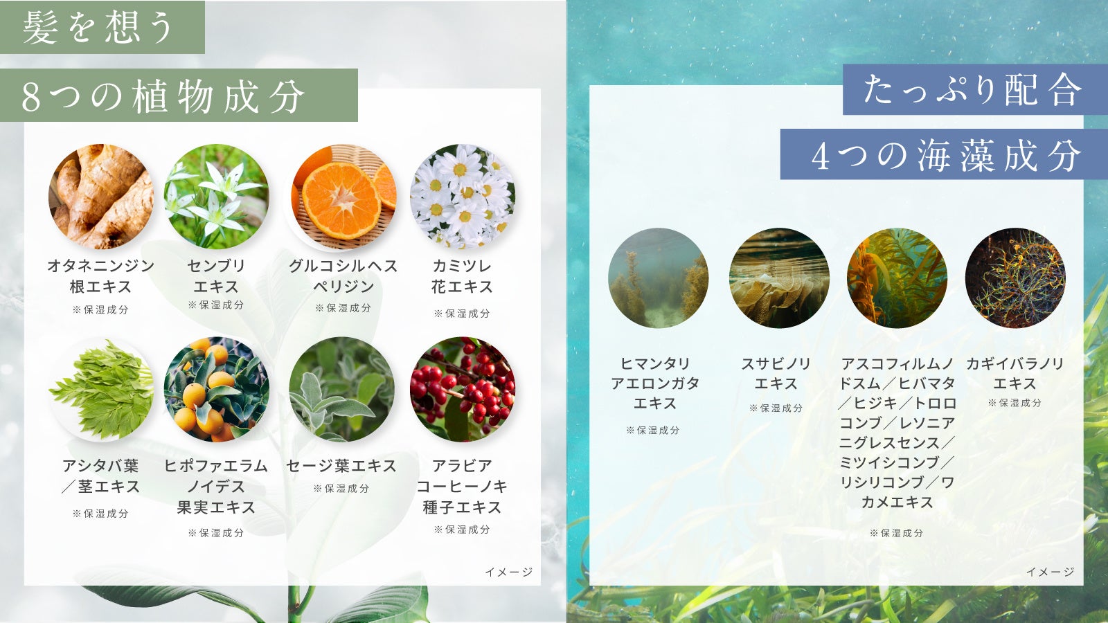 6つの特長成分、8つの植物エキス、4つの海藻エキスからなる美容成分が髪と頭皮を満たします。髪と頭皮が喜ぶことで、より満足したバスタイムを演出します。
