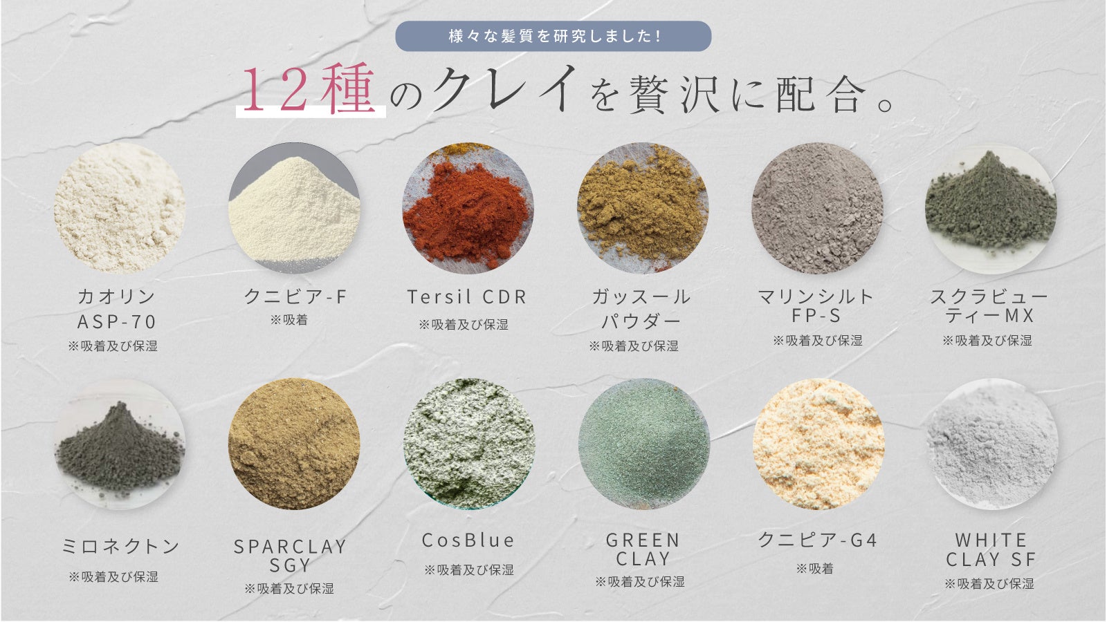 1.産地や粒子サイズ、効果の異なる12種類のクレイを贅沢に配合
