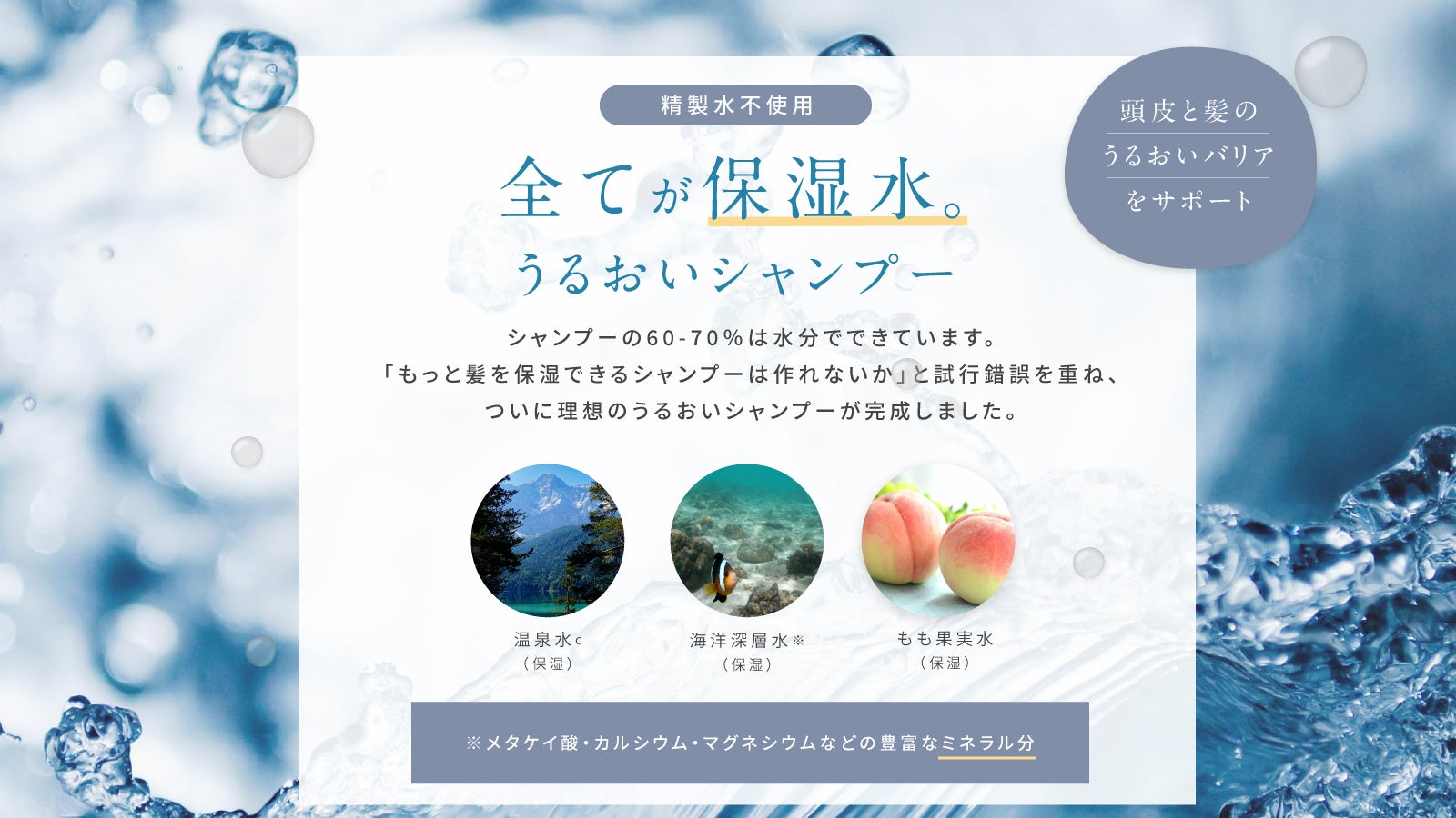 2.精製水を一切使わず温泉水や海洋深層水、果実水でシャンプーの根本から保湿を実感