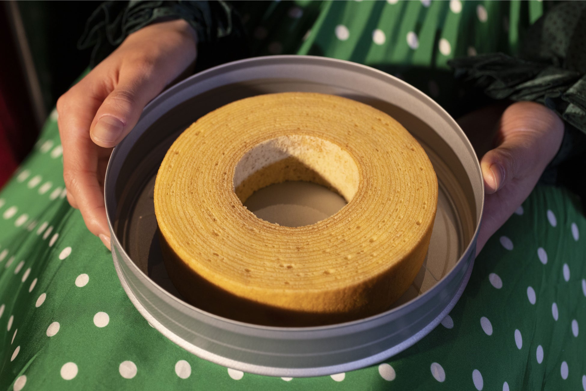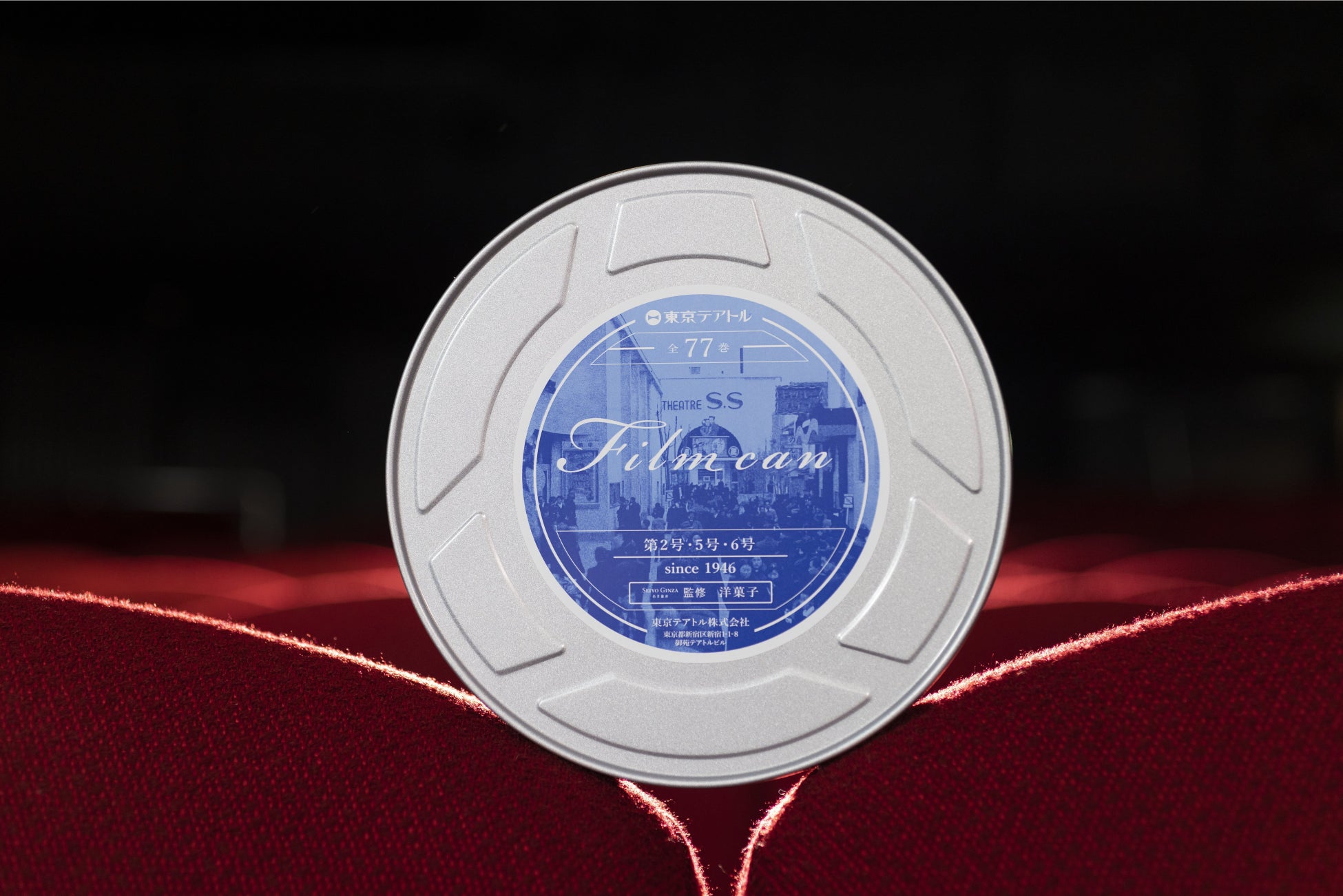 Film canは、予告編用のフィルム缶の中に、フィルムをイメージした西洋銀座監修のバウムクーヘンが入っています。ラベルに記載のある「全77巻」は、東京テアトル創立77周年、「2号・5号・6号」は、テアトル渋谷・テアトルハイツ・テアトルSSが、創立から何年目に開場したかを表現しています。 実際、かつてのフィルム缶にも「全○巻」「○号」と管理番号がプリントされていました。お土産としてもお求めいただけます。