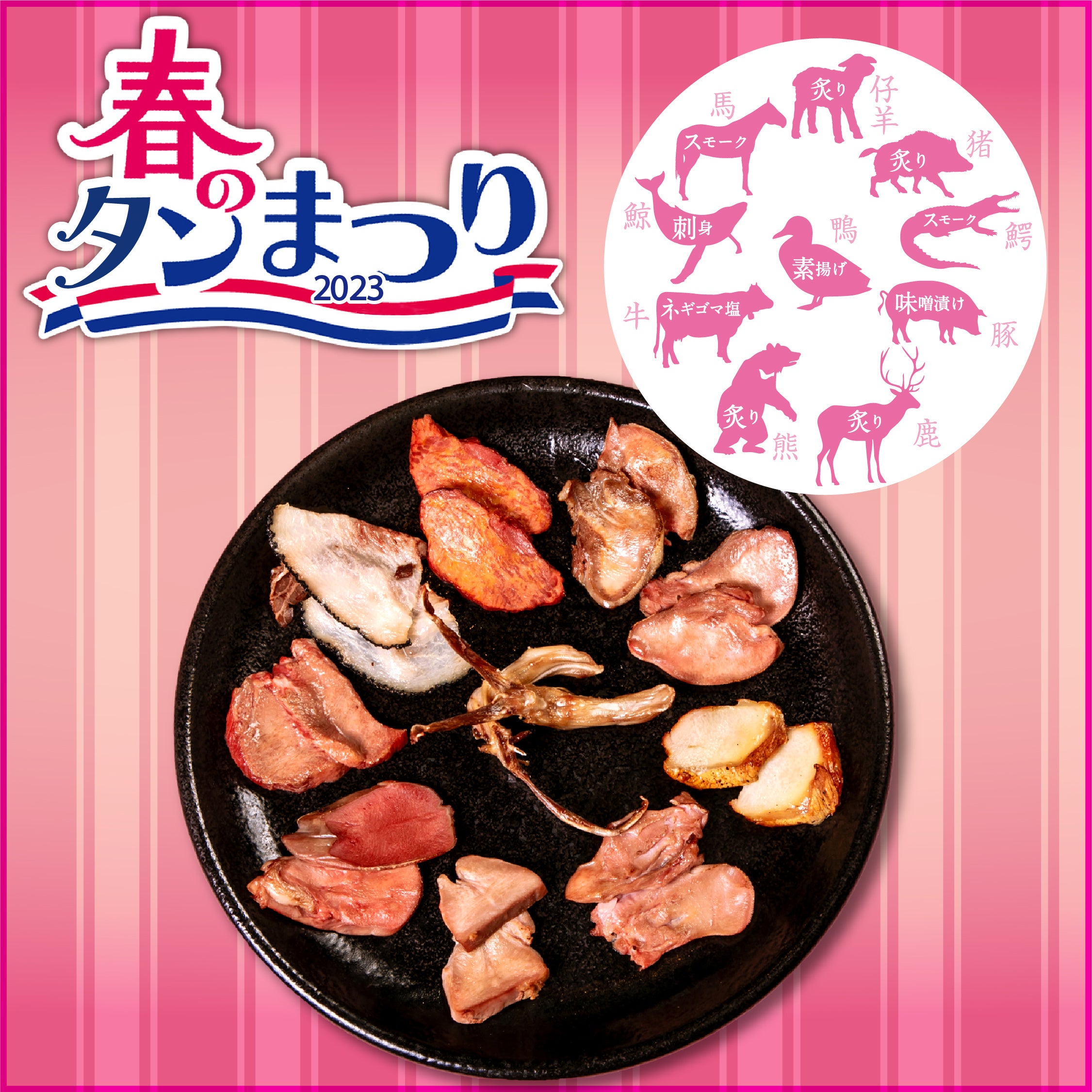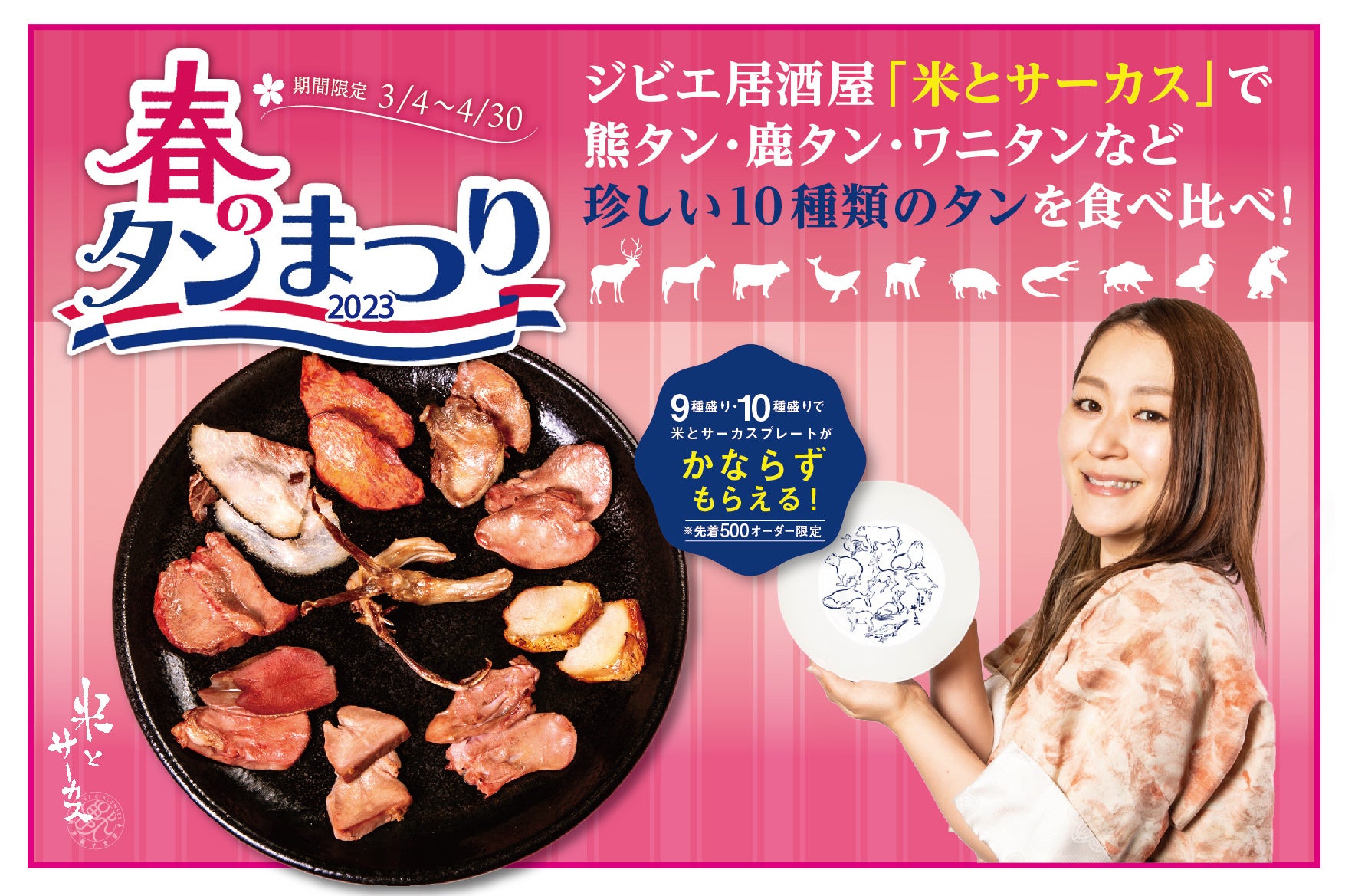 ジビエ居酒屋「米とサーカス」(高田馬場本店/渋谷PARCO店/錦糸町ダービー通り店)の3店舗合同で【春のタン祭り2023】を開催します。 3月4日(土)~4月30日(日)までの期間限定で、国内外から選び抜いたタン10種を食べ比べメニューとして提供。 さらに、期間中にタン盛り合わせをご注文した方全員に『米とサーカスプレート』をプレゼント。(先着500名様)今年6年目を迎える【春のタン祭り】は毎年楽しみにしていただいているファンの方も多い人気のフェアで、牛・豚はもちろん馬や羊、クジラ、ワニ、鴨、ジビエの鹿や猪、ヒグマといった希少なタンをスモークや炙りなどでお召し上がり頂けます。