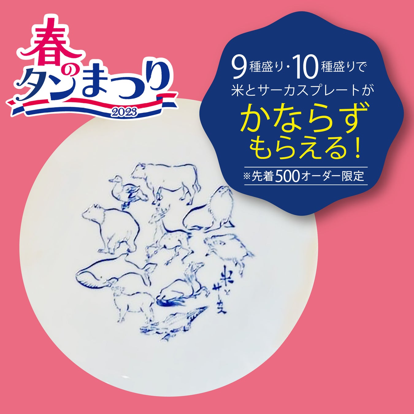 特典:期間中に「タン9種盛り」もしくは「タン10種盛り」を注文した方全員に『米とサーカスプレート』をプレゼント。(先着500名様)
