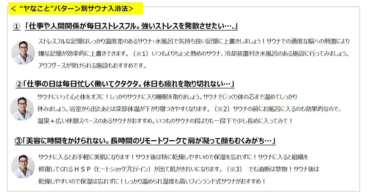 - ”サウナドクター”こと医学博士・加藤容崇先生直伝!”ヤなこと”パターン別おすすめサウナ入浴法