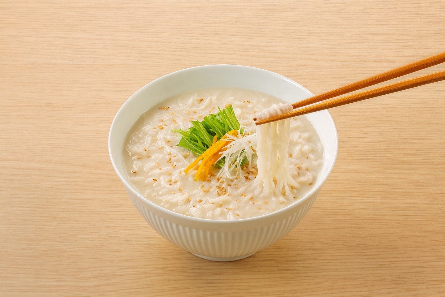 昆布としいたけの風味豊かなさっぱりとしたおいしさの“ゆず塩”だれは低脂肪豆乳がベースのスープと組み合わせることで、豆乳のコクとゆず塩のさっぱりした旨みと爽やかな香りを楽しめます。低脂肪豆乳をベースにつくった麺は、少し縮れた細麺タイプでスープとの絡みもよく、スープの旨みを楽しみながら食べられるのが特徴です。